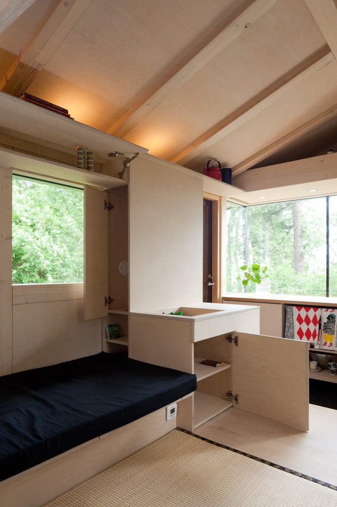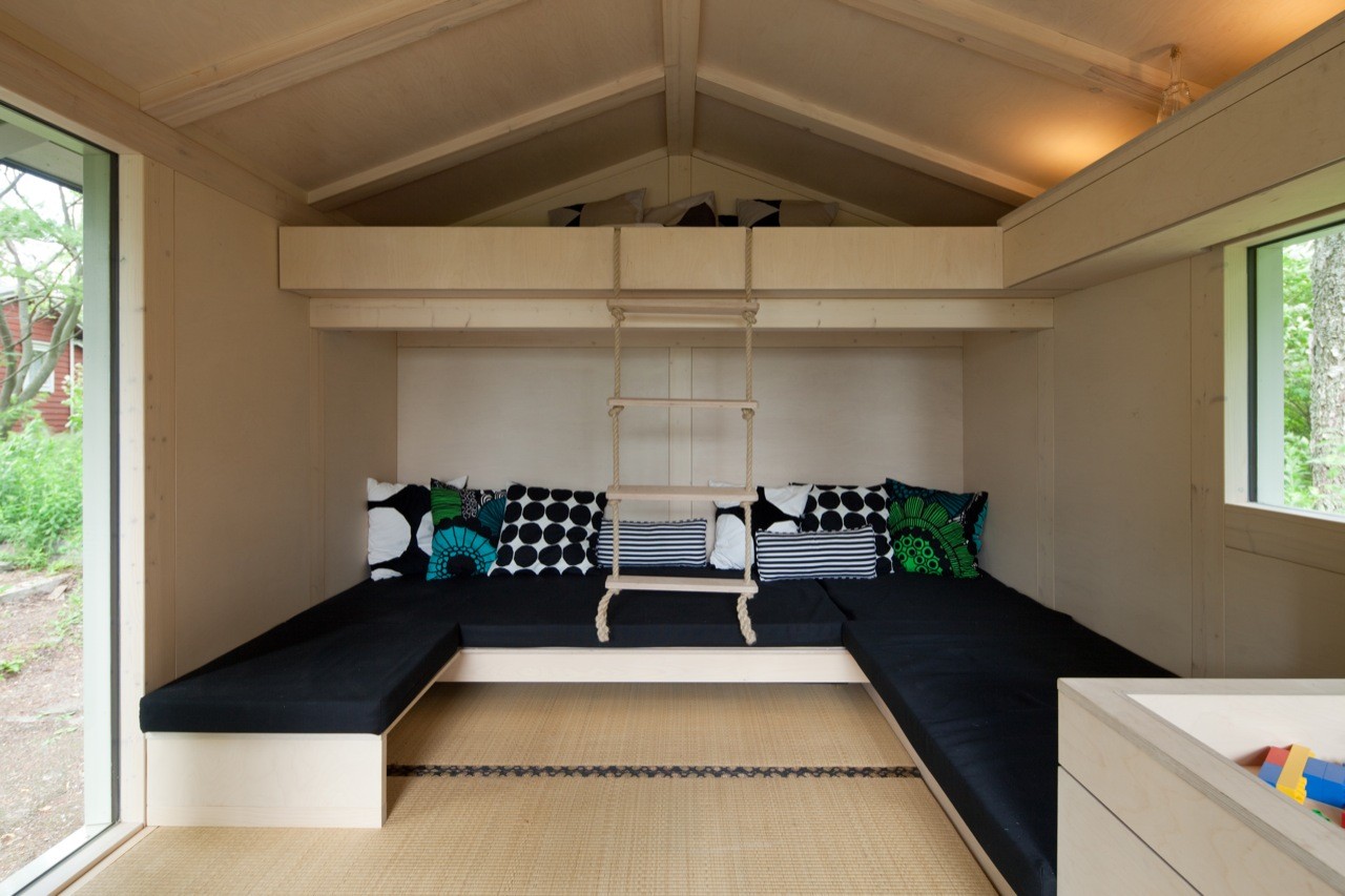 พื้นที่ส่วนการพักผ่อนส่วนหลังของบ้านจะออกแบบเป็นที่นอนในรูปตัวยู พร้อมกับมีห้องใต้หลังคาเล็ก ๆ สำหรับเด็ก ๆ ไว้อีกด้วย โดยจะสามารถปีนขึ้นไปได้ด้วยบันไดลิง