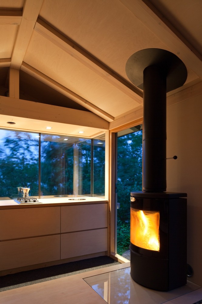 เพื่อให้การพักอาศัยภายในกระท่อมในช่วงหน้าหนาวได้ดี สถาปนิกจึงได้ติดตั้งเตาผิงเหล็กขนาดเล็กเอาไว้สร้างความอบอุ่นให้ภายในบ้านอีกด้วย