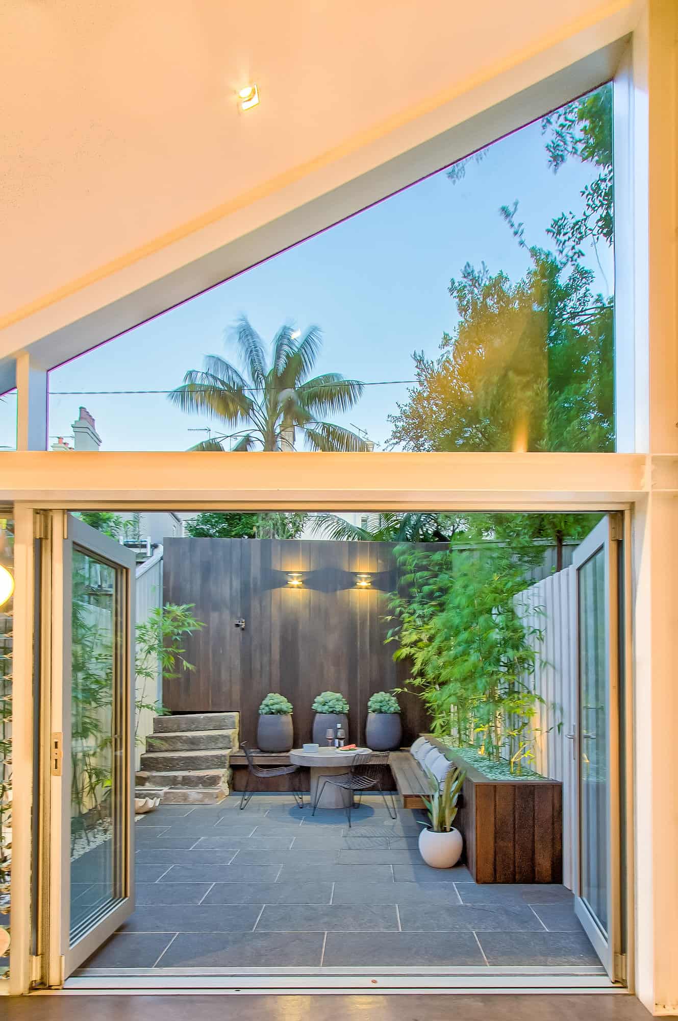 มุมมองจากภายในบ้าน จะเผยให้เห็นขนาดของพื้นที่พักผ่อนที่ตกแต่งใหม่ ซึ่งเป็นลานเล็ก ๆ หลังบ้าน สามารถเดินเข้าออกบ้านได้อย่างสะดวก