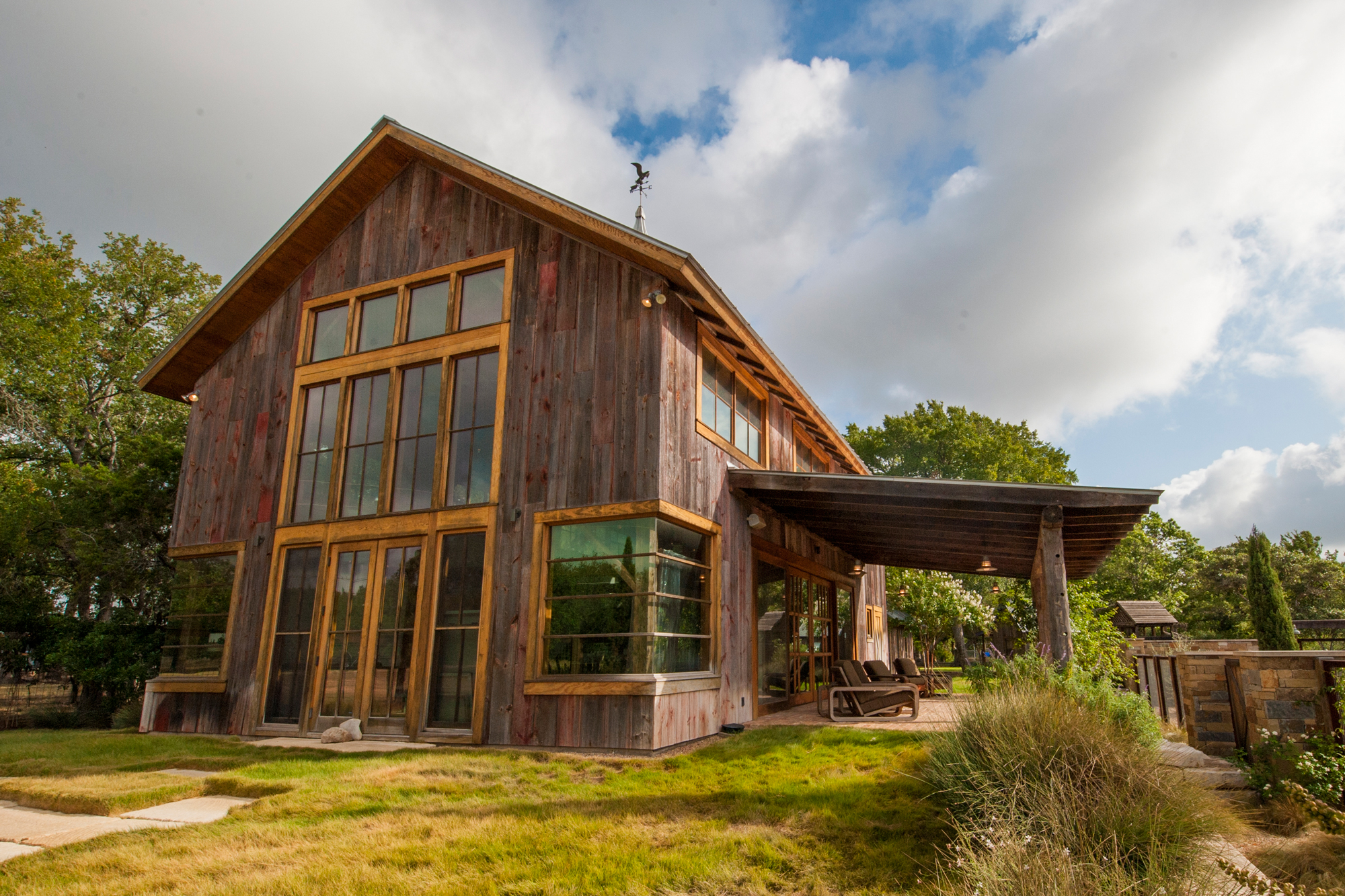 รูปแบบบ้านเลยเป็นแบบคอทเทจหลังใหญ่ ภายนอกนั้นเพิ่มความทันสมัยด้วยการติดกระจกหน้าต่างบนกรอบไม้ เพื่อทำให้พื้นที่ภายในได้รับแสงแดดส่องเข้าไปมากขึ้น ด้านข้างมีระเบียงและกันสาดยื่นออกมาไว้เป็นมุมนั่งเล่น เพื่อชมสวนสวยๆและสนามหญ้าสีเขียวที่ทำไว้รอบบ้าน