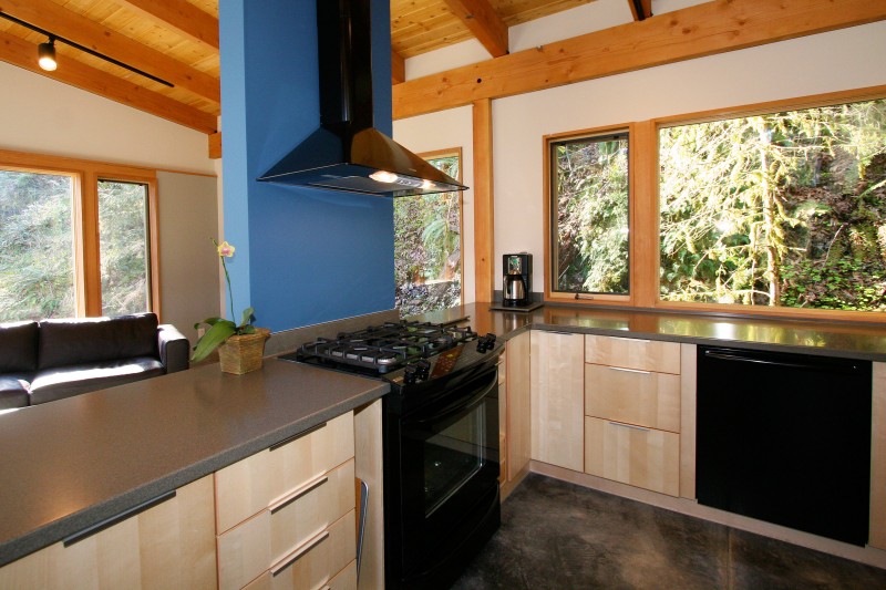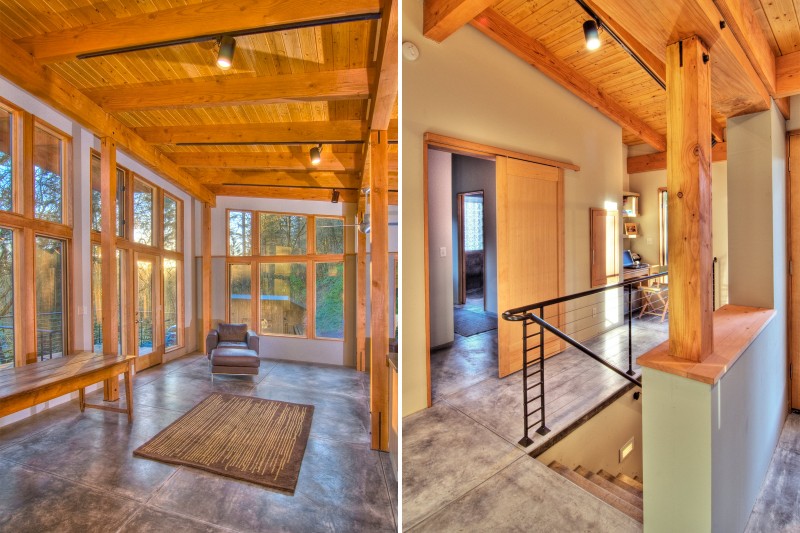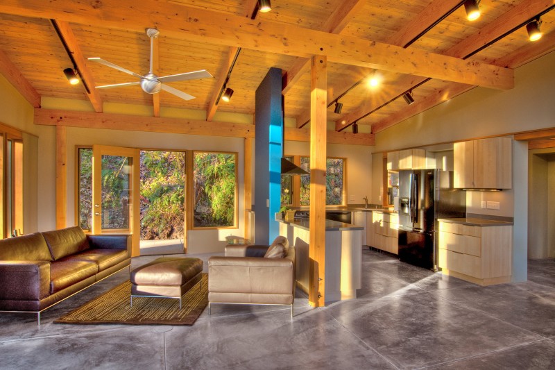 เข้าไปภายในยังดูกว้างไม่อึดอัด หน้าต่างกระจกบานใหญ่ช่วยให้แสงแดดจากธรรมชาติส่องเข้าไปในตัวบ้านได้อย่างมาก เน้นการตกแต่งภายในอย่างเรียบง่าย ด้วยโครงสร้างไม้ เข้ากับพื้นปูนและหินขัดซึ่งให้ความเย็นสบาย