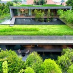 ด้วยพื้นที่ตั้งนอกเมือง ทำให้นอกจากตัวบ้านแล้ว ยังมีพื้นที่เหลือใช้ให้ตกแต่งเป็นสวนสวยๆ เจ้าของเลือกทำเป็นสนามหญ้าดูสีเขียวสบายตา ส่วนตัวบ้านชั้นเดียวหลังใหญ่ ยกพื้นขึ้นสูงมานิดหน่อย ออกแบบหลังคาทรงสามเหลี่ยมมีเอกลักษณ์