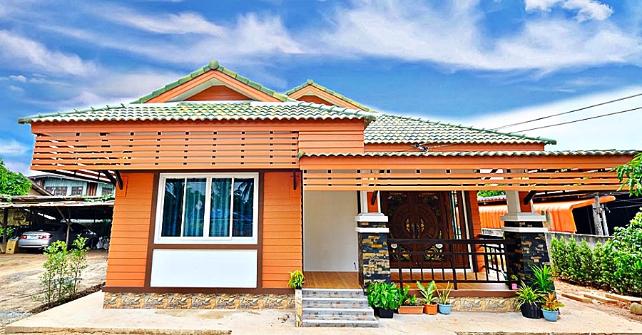 บ้านสไตล์คอนเทมโพรารีชั้นเดียวหลังนี้ มีหลังคาทรงมานิลา ปูด้วยกระเบื้องสีเขียวสบายตา ชายคาบ้านตกแต่งด้วยไม้ระแนงสีส้มกันลมกันแดด สีเดียวกับไม้ที่ใช้กรุตกแต่งผนังด้านหน้า