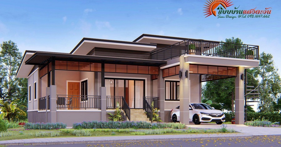 หากเพื่อนๆ ชื่นชอบโทนสีธรรมชาติอย่าง สีเอิร์ธโทน ล่ะก็ ลองมาชมแบบบ้านหลังนี้กันดูครับ ผลงานการออกแบบโดย แบบบ้านแสงตะวัน นอกจากจะใช้โทนสีอบอุ่นและอ่อนโยนแล้ว ยังมีชั้นดาดฟ้าเอนกประสงค์อีกด้วย