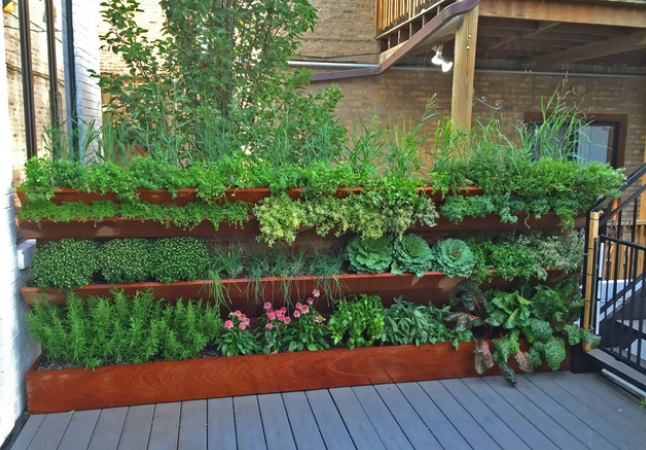 อีกหนึ่งไอเดียของบ้านที่พอจะมีพื้นที่ดินบ้างแต่ไม่มาก เราสามารถนำไอเดียจากสวนแนวตั้งมาปรับใช้ได้ โดยจะเป้นการทำพื้นที่สวนแบบแปลงทั่วไป แต่ต่อเติมให้มีระดับแบบขั้นบันได เราก็จะได้พื้นที่ทำสวนผักที่คุ้มค่าสุดๆ แล้ว