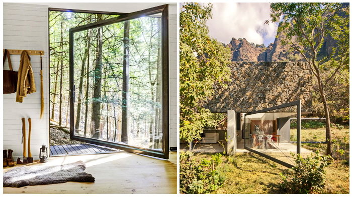 ประตูกระจกใสบานใหญ่ แต่ขอบด้วยโลหะสีเข้ม ออกแบบการเปิดปิดด้วยลักษณะแกนหมุน ให้ลักษณะที่มีเอกลักษณ์น่าดึงดูด