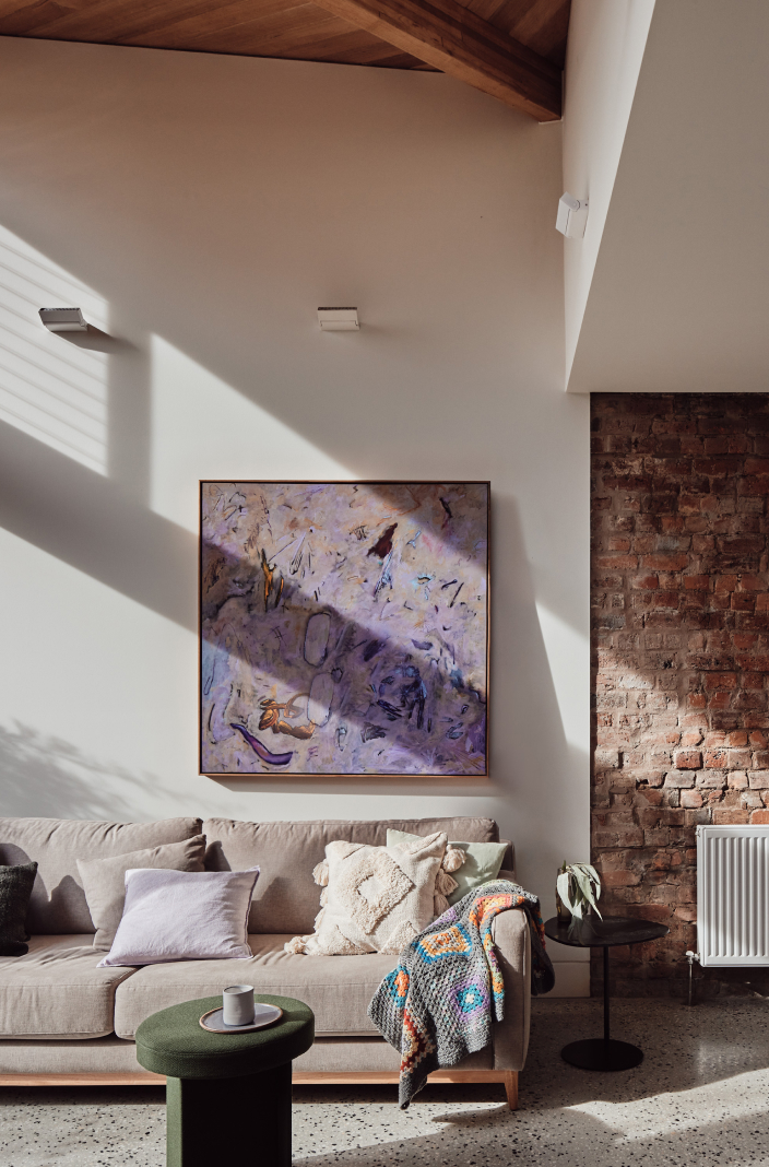 มุมที่เป็นโซฟานั่งเล่น ก็จะเลือกใช้โซฟาที่มีสีเอิร์ธโทน ซึ่งก็เข้ากับธีมการตกแต่งหลักของบ้าน
