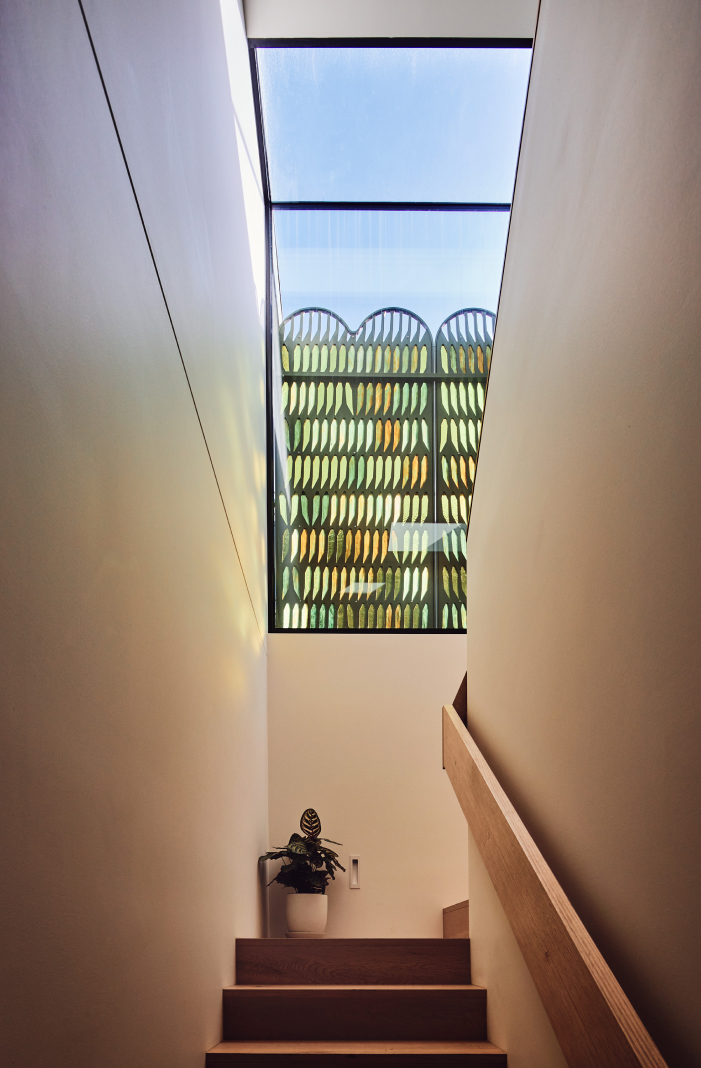 เมื่อเราขึ้นไปยังชั้นสองของบ้าน ก็จะต้องเดินผ่านโถงตรงนี้ที่ตกแต่งอย่างพิเศษ โดยจะมีหลังคาแบบสกายไลท์ และกระจกสีที่ให้ความสวยงามเฉพาะตัว