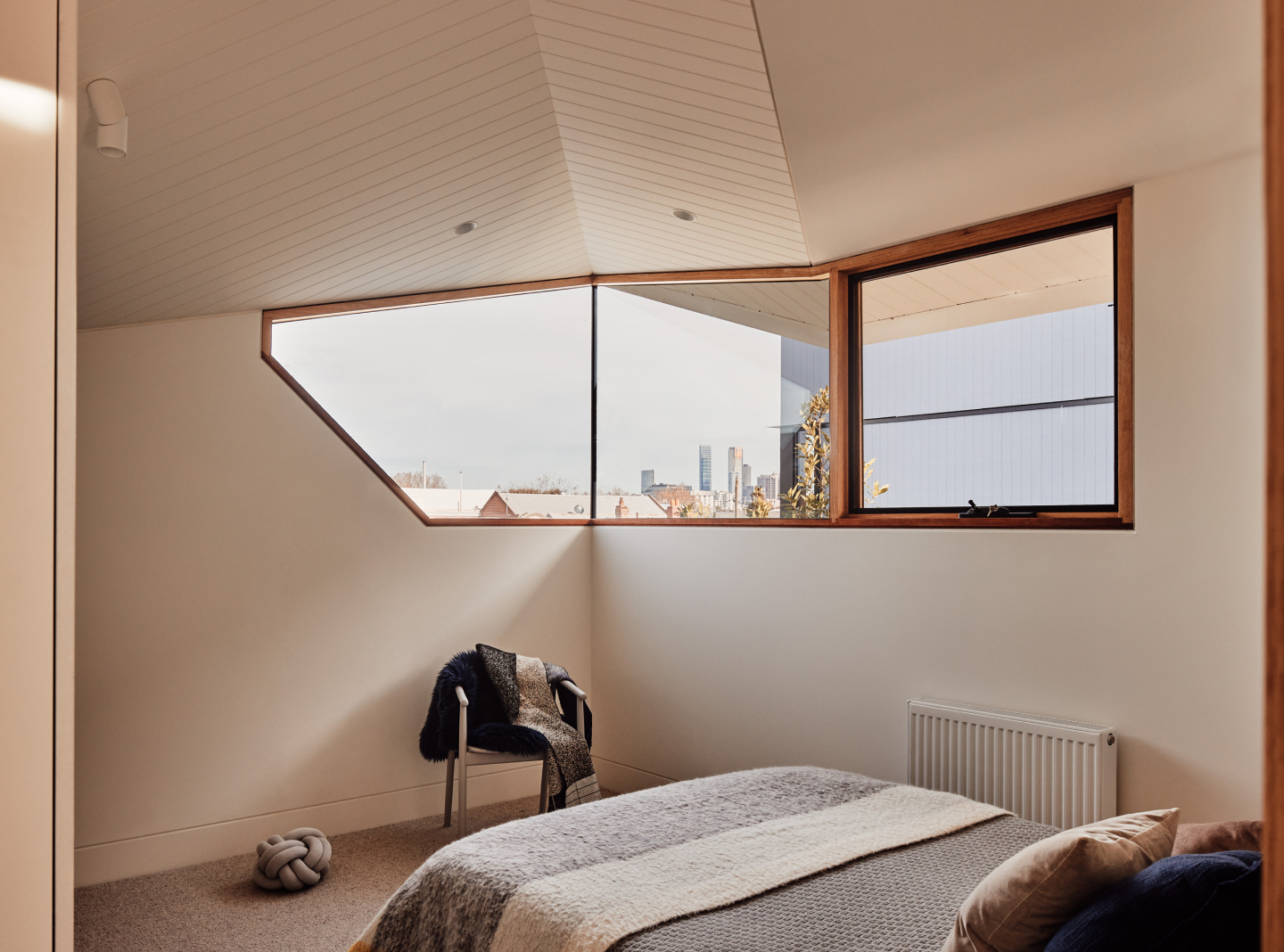 ภายในห้องนอนมีการออกแบบให้เพดานยกสูง รวมถึงมีหน้าต่างแบบยาว จึงทำให้ภายในห้องนอนมีความโปร่งสบายและผ่อนคลายได้เป็นพิเศษ