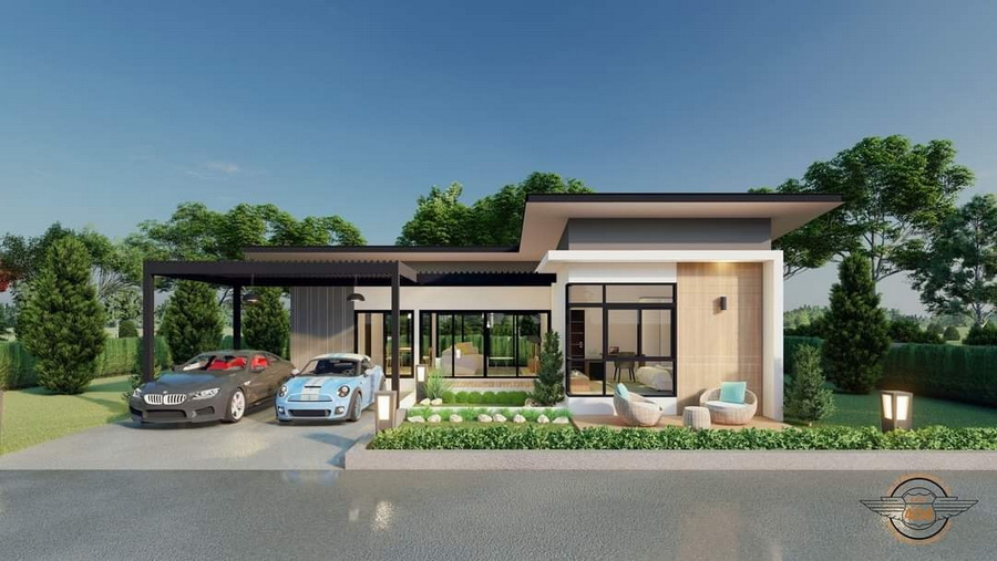 บ้านชั้นเดียวหน้ากว้างหลังสั้นทรงตัวแอล ลักษณะอาคารรูปทรงสี่เหลี่ยมตามแบบฉบับบ้านโมเดิร์น มีหลังคาเป็นแบบเพิงหมาแหงนที่เข้ากันดีกับตัวบ้าน ด้านรายละเอียดการตกแต่งนั้น ผนังภายนอกเลือกใช้สีขาวครีมยืนพื้น ตัดตามขอบประตูหน้าต่างด้วยสีน้ำที่ให้ความทันสมัย