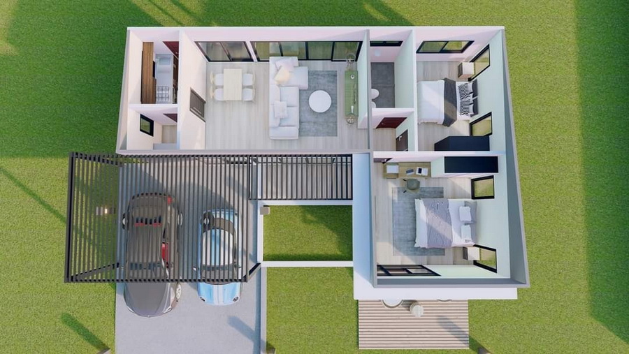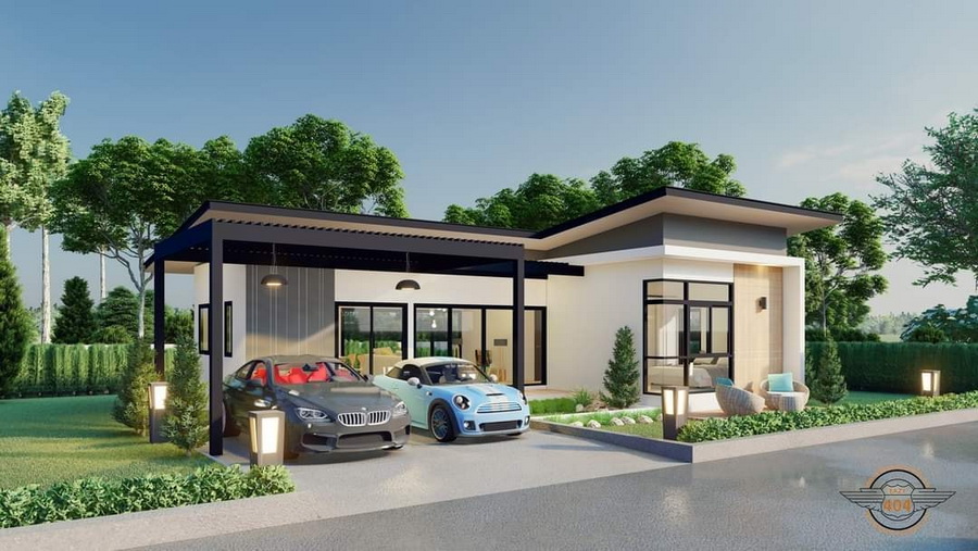 แบบบ้านชั้นเดียวสไตล์โมเดิร์นหลังนี้ประกอบไปด้วย 2 ห้องนอน 2 ห้องน้ำ 2 ที่จอดรถ 1 ห้องโถงนั่งเล่น 1 ห้องครัว พร้อมที่จอดรถ 2 คัน พื้นที่ใช้สอยรวม 109 ตารางเมตร งบก่อสร้างอยู่ที่ประมาณ 1.19 ล้านบาท แบบแปลนพร้อมวิศวกรรับรองคิดค่าใช้จ่าย 19,500 บาท (พร้อม BOQ)