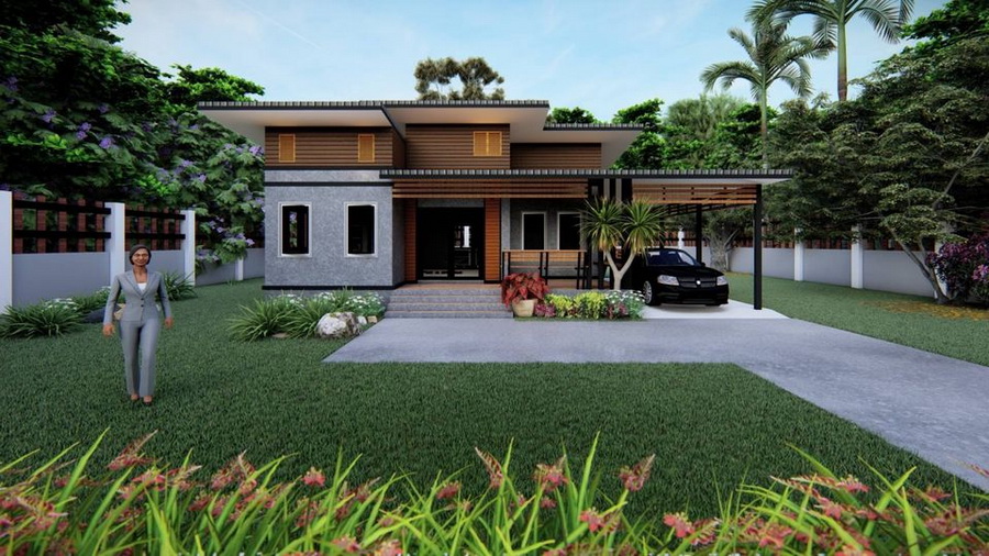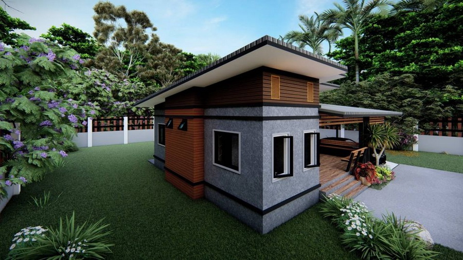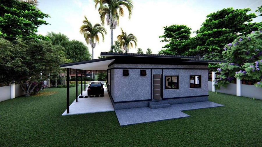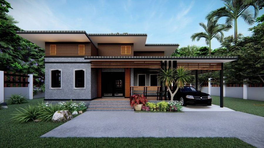 แบบบ้านหลังนี้เป็นบ้านชั้นเดียว ฐานของบ้านถูกยกขึ้นสูง ตัวบ้านมีรูปแบบการออกแบบดีไซน์ในแบบเรียบง่ายตามแบบฉบับของบ้านสไตล์โมเดิร์น ความโดดเด่นอยู่ที่การตกแต่งด้วยหลังคาทรงเพิงหมาแหงนแบบเล่นระดับสวยงาม พร้อมกับการตกแต่งด้วยผนังปูนเปลือยแบบสวยดิบ
