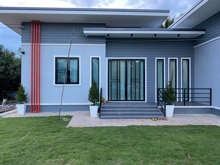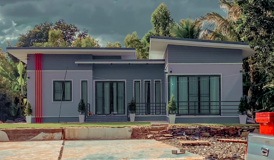 บ้านหลังนี้เป็นบ้านชั้นเดียว ออกแบบหน้ากว้าง ตัวบ้านมีรูปทรงสี่เหลี่ยมแบบเรียบง่ายที่ให้กลิ่นอายแบบโมเดิร์นอย่างชัดเจน ความโดดเด่นของบ้านหลังนี้จะอยู่ที่การออกแบบหลังคาแบบผสมผสานทั้งแบบเรียบและแบบเพิงหมาแหงน ด้านการตกแต่งนั้น ผนังภายนอกเลือกใช้โทนสีเทาที่ช่วยให้บ้านอยู่มีความสบายตา