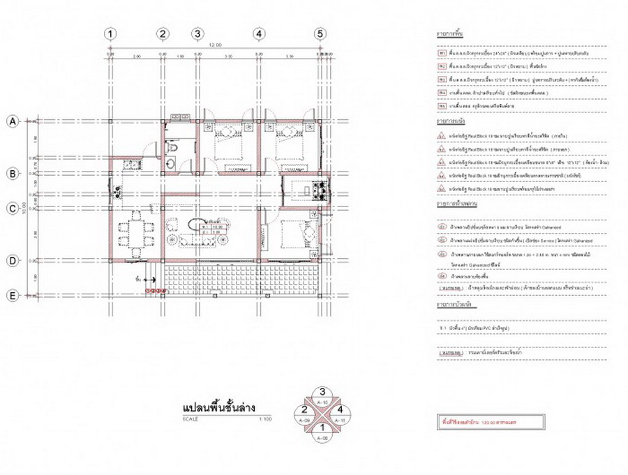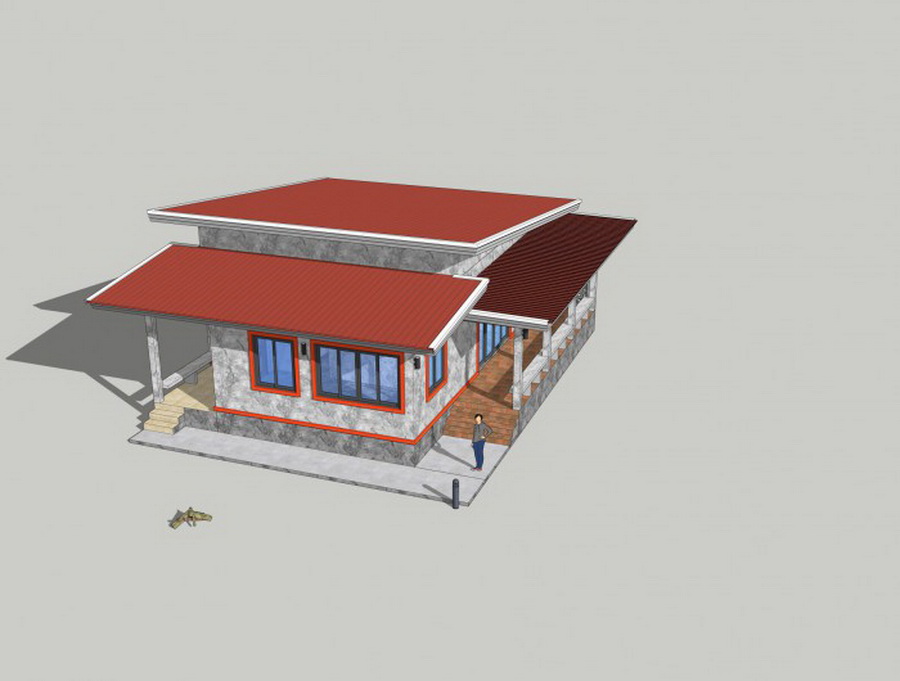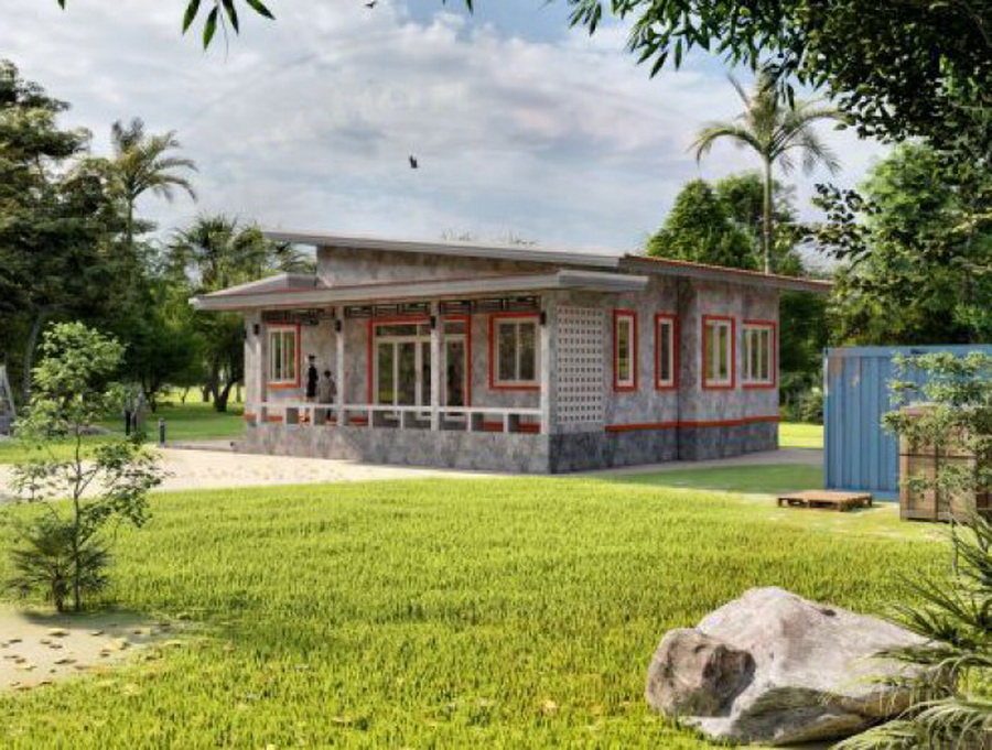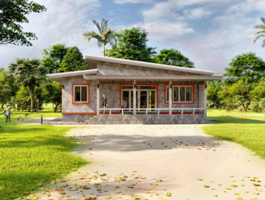 แบบบ้านชั้นเดียวทรงโมเดิร์นยกพื้นสูงหลังนี้ประกอบไปด้วย 3 ห้องนอน 1 ห้องน้ำ 1 ห้องโถงนั่งเล่น 1 ห้องครัว พื้นที่ใช้สอยทั้งหมดประมาณ 120 ตารางเมตร งบก่อสร้างอยู่ที่ประมาณ 1.5 ล้านบาท