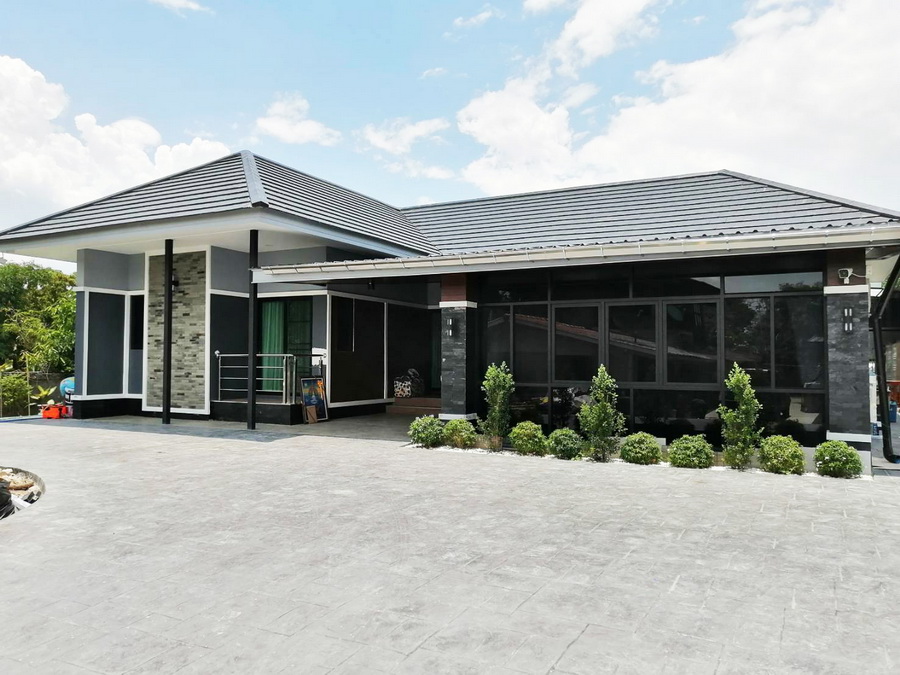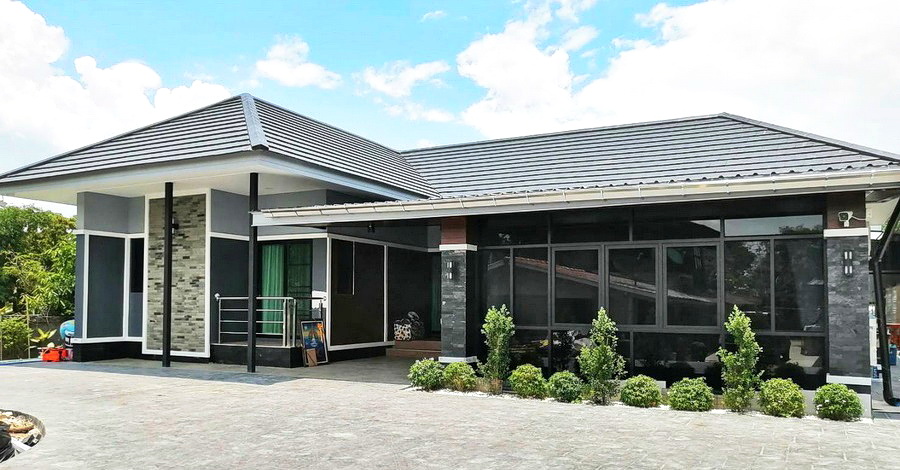 โดยบ้านสไตล์คอนเทมโพรารีหลังนี้เป็นบ้านชั้นเดียวที่โดดเด่นด้วยดีไซน์ทรงตัวแอล (L shape house) จึงเหมาะกับที่ดินกว้างๆ บ้านหลังนี้ถูกตกแต่งด้วยหลังคาทรงปั้นหยาที่มุงด้วยกระเบื้องแบบเรียบ ผนังภายนอกเลือกใช้เฉดสีโทนเข้ม ให้บรรยากาศที่สงบสุขุม