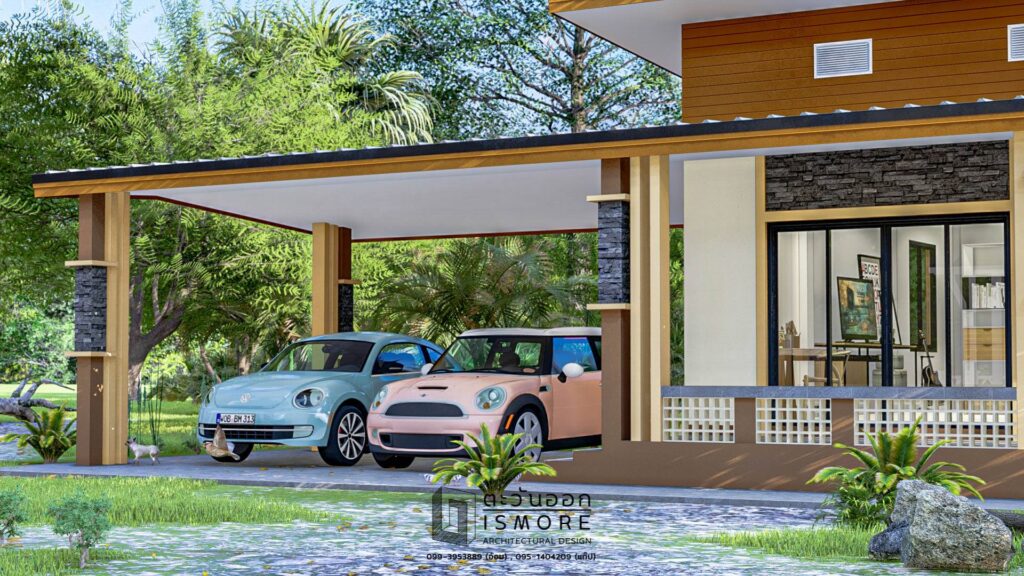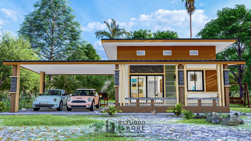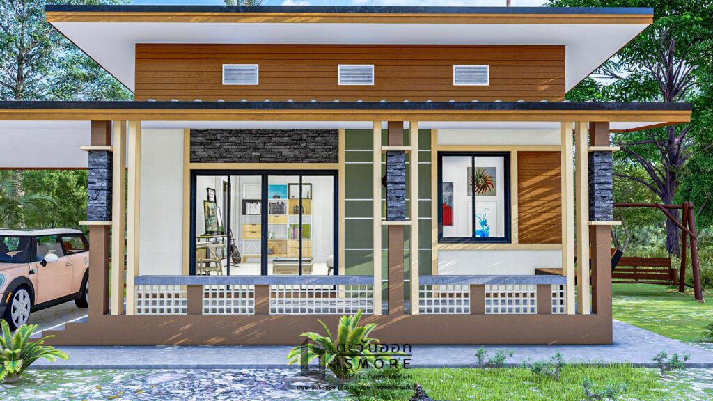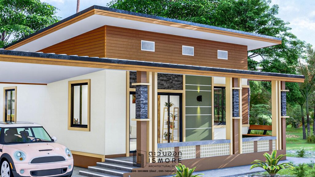 บ้านขนาดชั้นเดียว หลังคาทรงเพิงหมาแหงน ตกแต่งผนังบริเวณใต้หลังคาด้วยแผ่นไม้ มีโรงจอดรถในตัวพื้นที่กว้างขวาง ตัวบ้านภายนอกตกแต่งด้วยสีเอิร์ธโทน ผนังทาด้วยสีขาว แทรกไปด้วยสีน้ำตาล นอกจากนี้ยังมีการเพิ่มความสวยงามด้วยอิฐหินทรายสีเทาเข้ามตามเสาบ้านอีกด้วย