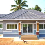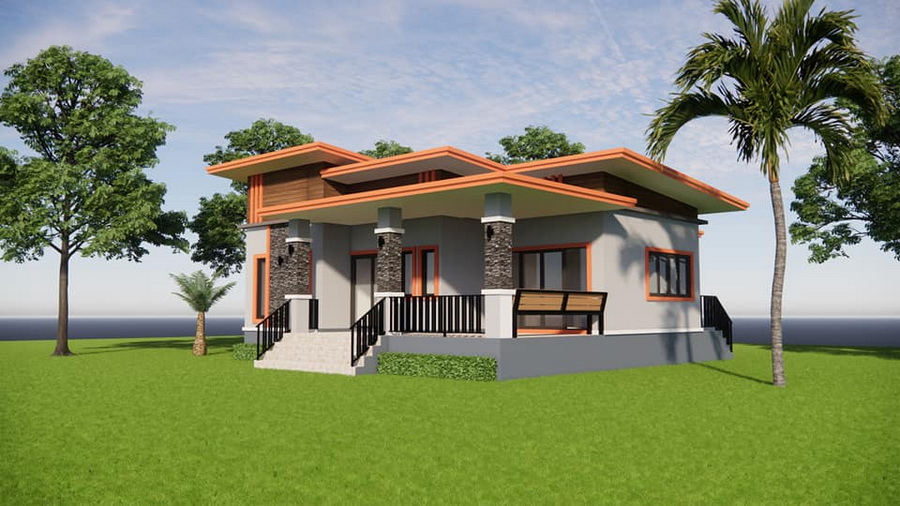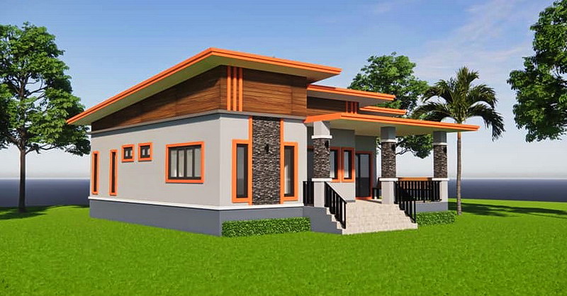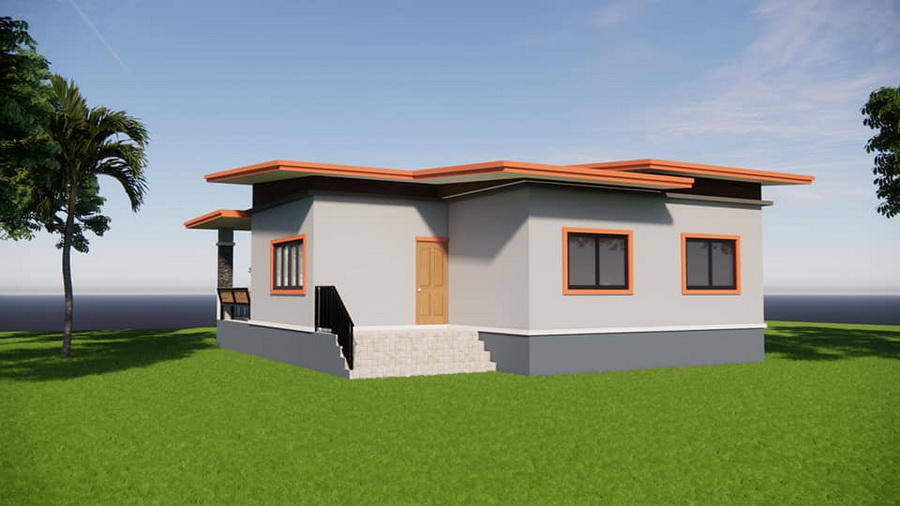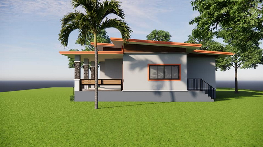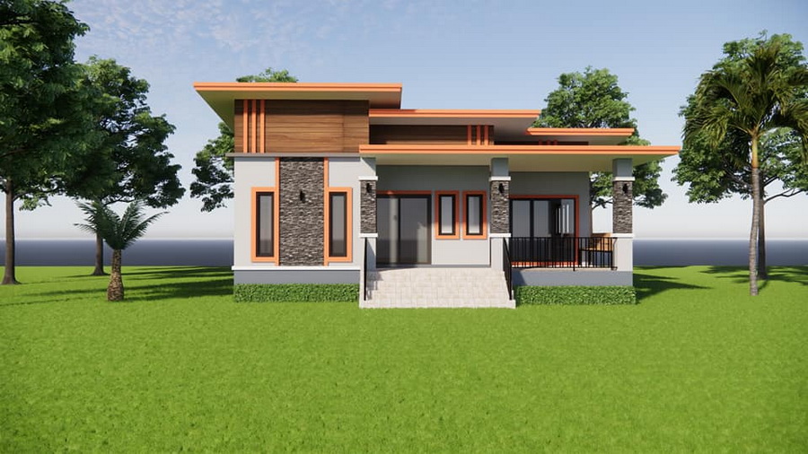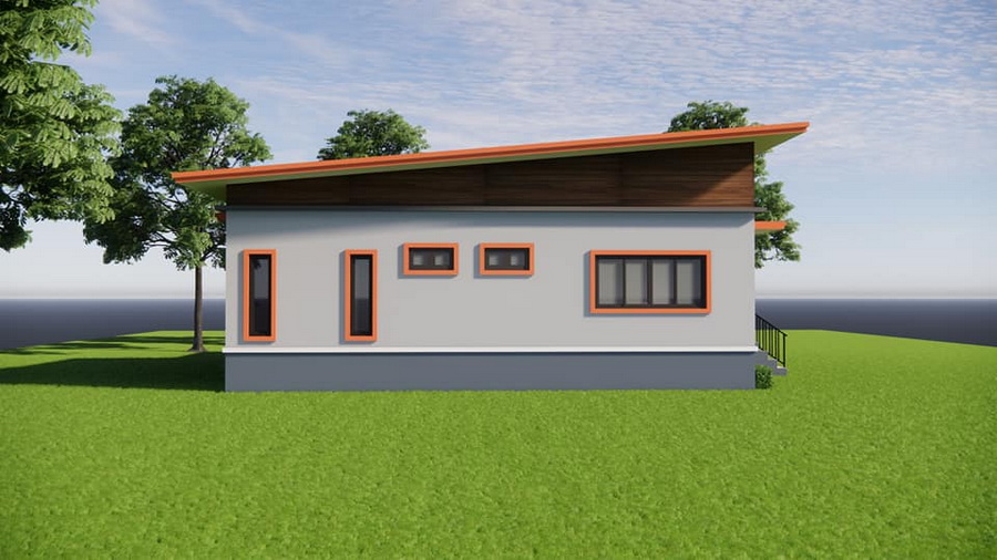 แบบบ้านสไตล์โมเดิร์นหลังนี้เป็นบ้านชั้นเดียว ฐานของบ้านถูกยกขึ้นสูงเพื่อป้องกันปัญหาน้ำท่วมขัง ตัวบ้านมีดีไซน์แบบสี่เหลี่ยมเรขาคณิตที่ให้กลิ่นอายแบบโมเดิร์น ตัวหลังคาบ้านดีไซน์ในแบบเพิงหมาแหงนเล่นระดับ ซึ่งเข้ากับตัวบ้านได้เป็นอย่างดี