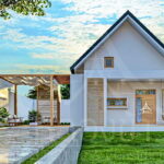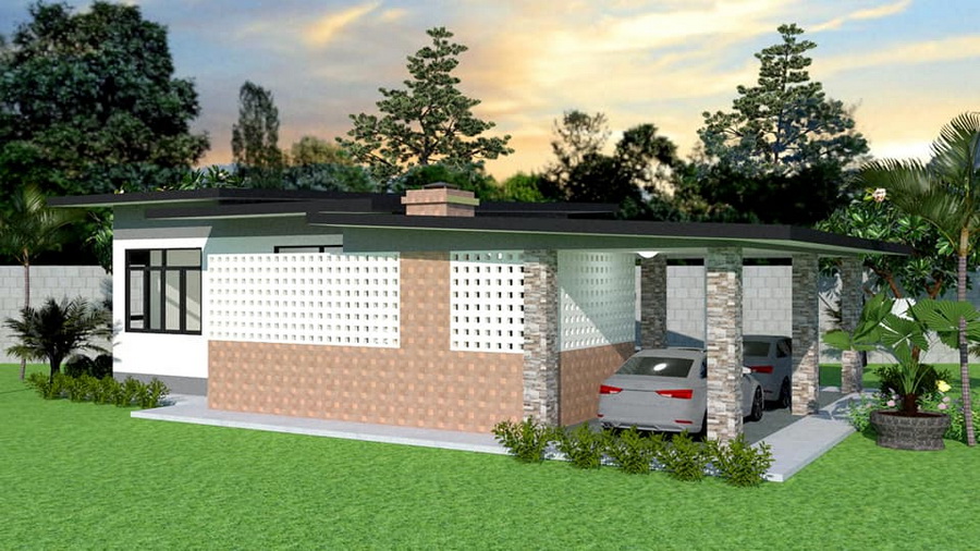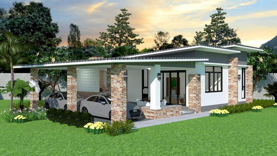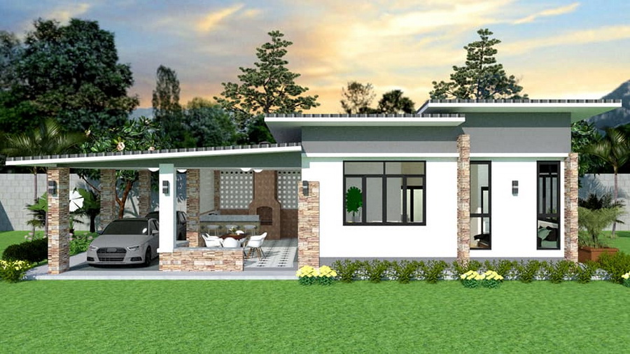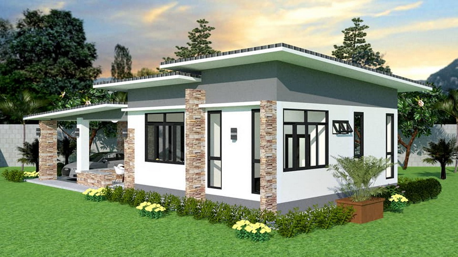 แบบบ้านหลังนี้เป็นบ้านชั้นเดียว ตัวบ้านมีดีไซน์ที่เรียบง่ายในทรสี่เหลี่ยมแบบโมเดิร์น หลังคาของบ้านเป้นแบบทรงเพิงหมาแหงนท่เข้ากันดีกับตัวบ้าน ด้านการตกแต่งนั้น ผนังภายนอกเลือกใช้โทนสีขาวครีมยืนพื้น แซมด้วยโทนสีเทาและสีน้ำตาลจากกระเบื้องลายหิน