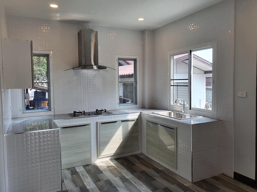ทางด้านห้องครัว เป็นห้องที่มีพื้นที่ในขนาดพอเหมาะ พร้อมกับมีเคาน์เตอร์ครัวที่สามารถใช้งานได้อย่างสะดวกสบาย และโปร่งโล่งด้วยหน้าต่างถึง 3 บาน