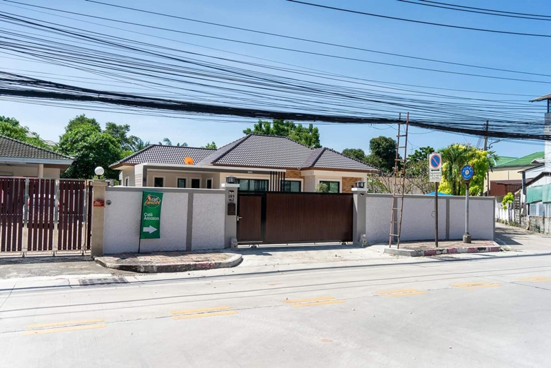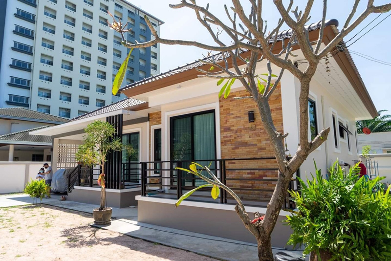 ลักษณะบ้านชั้นเดียว เป็นบ้านหน้ากว้างที่มีฐานยกขึ้นสูงเพื่อป้องกันปัญหาความชื้นและน้ำท่วมขัง งานดีไซน์ของบ้านมีความเรียบง่ายตามแบบฉบับบ้านทรงร่วมสมัย ออกแบบหลังคาด้วยทรงปั้นหยาที่มุงด้วยกระเบื้องลอนสีเข้ม ผนังภายนอกเลือกใช้โทนสีครีมยืนพื้น แซมด้วยกระเบื้องลายอิฐสีน้ำตาล