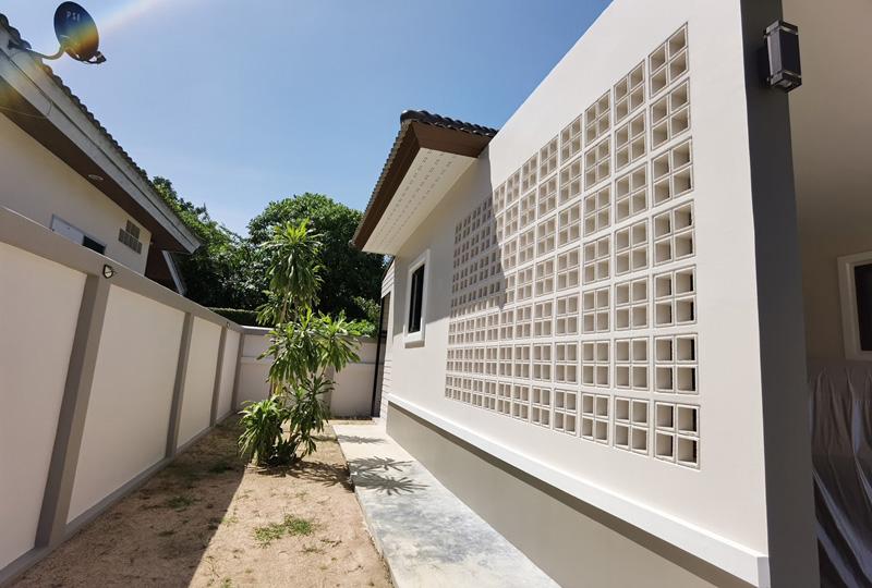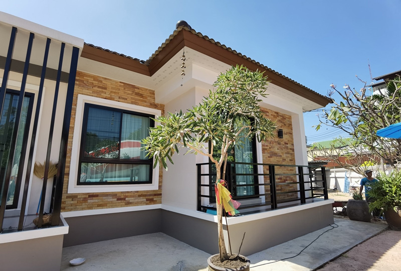 ผนังลายอิฐสีน้ำตาลที่เข้ากันกับหลังคาปั้นหยาสีเข้ม