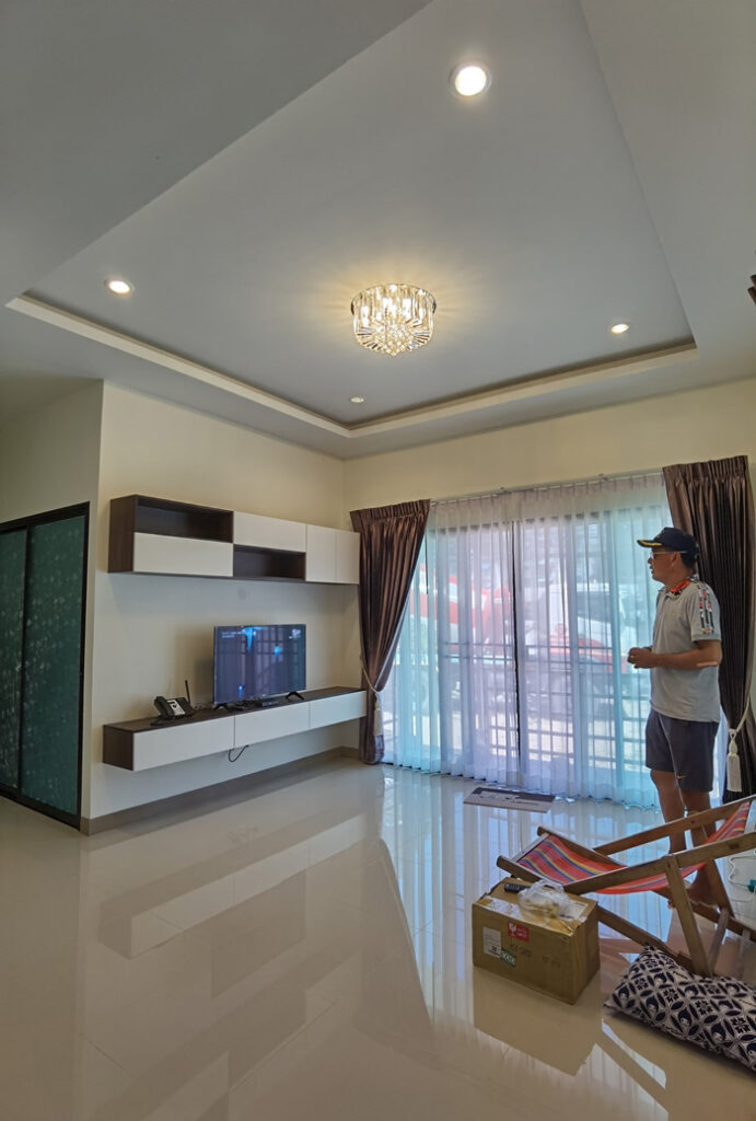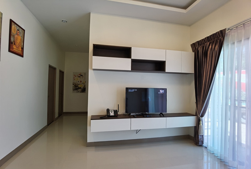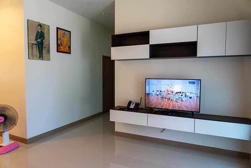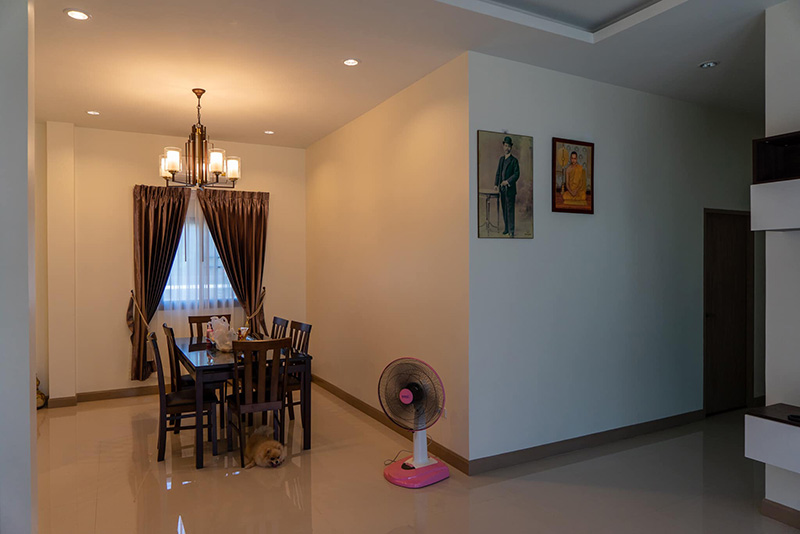 เมื่อเข้ามาภายในบ้าน เราก็จะพบกับห้องโถงนั่งเล่นขนาดใหญ่ที่ภายในตกแต่งเป็นมุมพักผ่อนและมุมเพื่อความบันเทิง โดยมีโซฟาชุดใหญ่และชั้นวางทีวีอีกด้วย