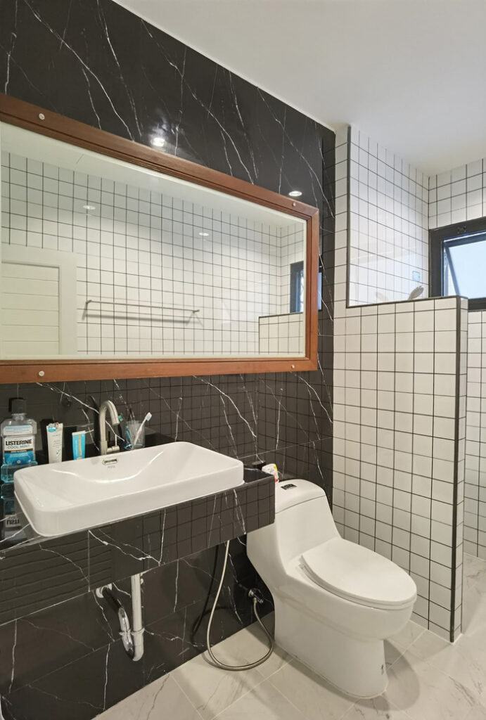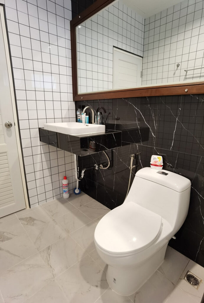 ทางด้านของห้องน้ำนั้น ภายในตกแต่งอย่างสวยงามหรูหราด้วยกระเบื้องลายกินอ่อนสีดำ พร้อมกับการแบ่งพื้นที่ใช้สอยแบบแห้งและแบบเปียกอย่างเป็นสัดส่วน