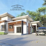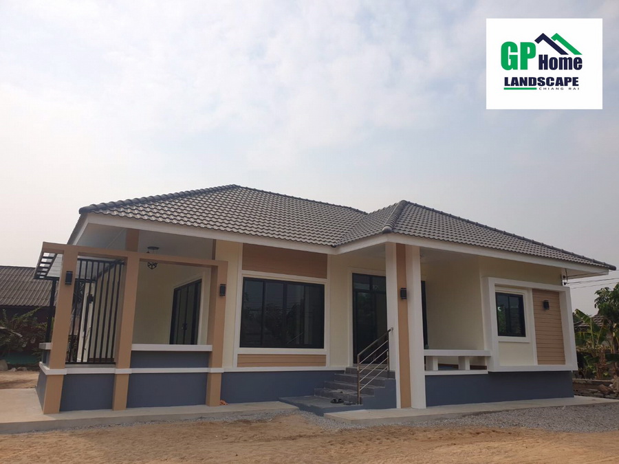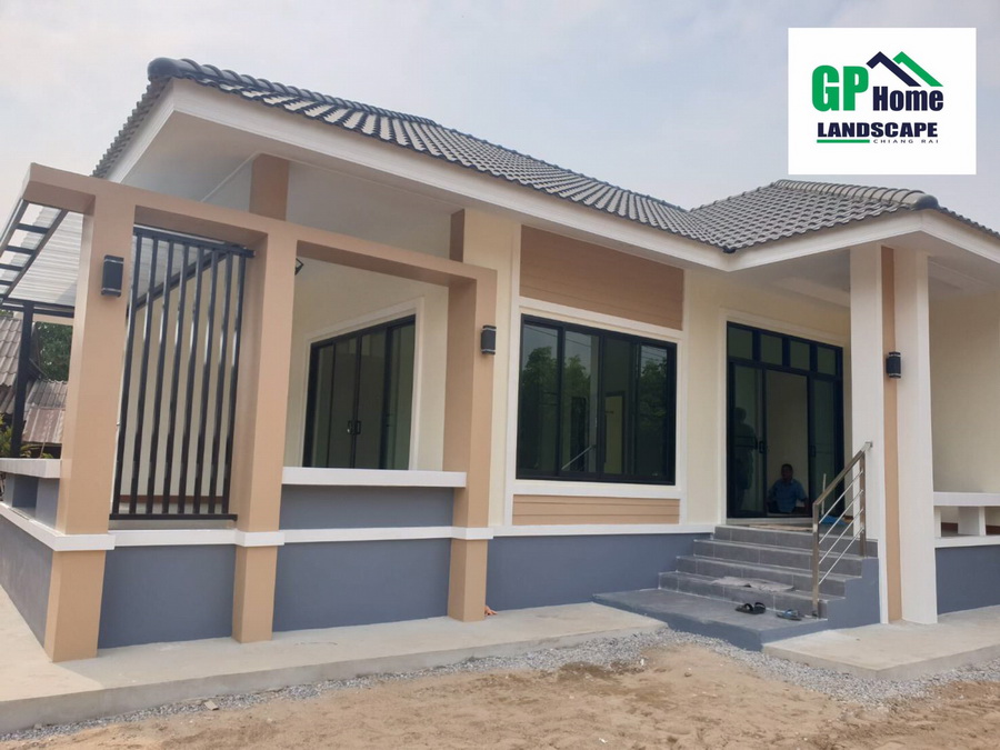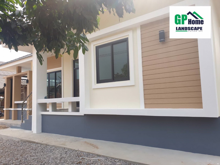 ลักษณะบ้านชั้นเดียว ฐานของบ้านถูกยกขึ้นสูง ตัวบ้านมีดีไซน์ตามแบบฉบับของบ้านทรงร่วมสมัยอย่างครบถ้วน มีหลังคาทรงปั้นหยาที่มุงด้วยกระเบื้องลอนสีเข้มที่โดดเด่น รายละเอียดส่วนอื่นๆ ของบ้านให้รายละเอียดที่เรียบง่ายแต่ดูแล้วสบายตาน่ามอง