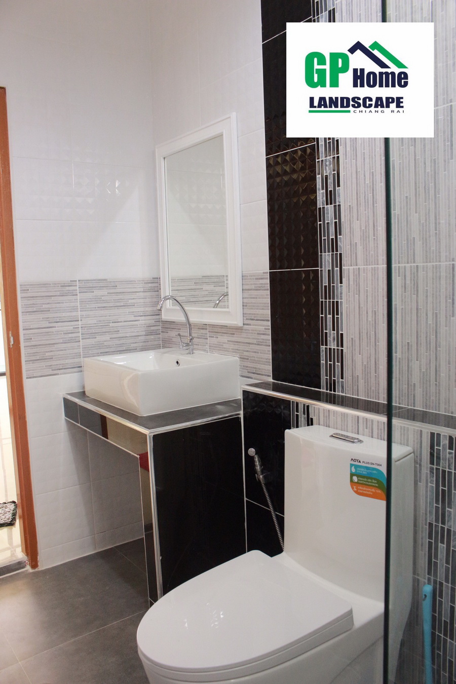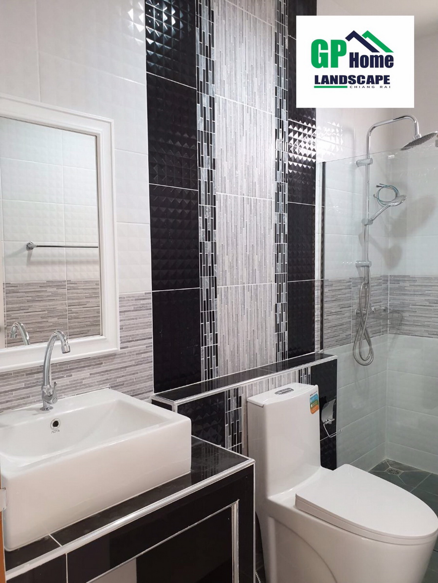 และสำหรับห้องน้ำ จะเป็นห้องที่ให้ความใส่ใจในรายละเอียดการตกแต่งที่ค่อนข้างมาก ภายในจึงให้บรรยากาศแบบโมเดิร์นด้วยกระเบื้องดีไซน์สวยงาม พร้อมกับภายในมีสิ่งอำนวยความสะดวกที่ครบครัน