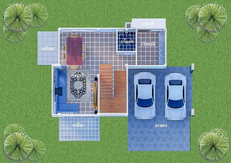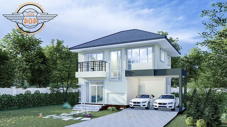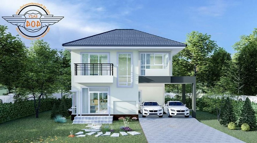 ภาพจากมุมหน้าบ้านเราจะเห็นได้ว่ามีพื้นที่รเบียงชั้นสอง เฉลียงเล็ก ๆ ด้านล่าง ด้านข้างยังออกแบบให้เป้นพื้นที่สำหรับจอดรถได้ถึงสองตันอีกด้วย