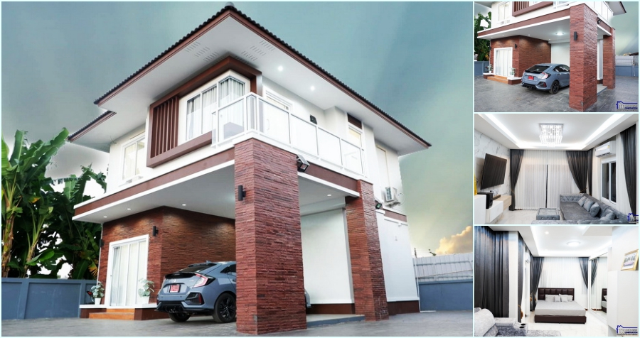 บ้านหลังนี้เป็นบ้านขนาดสองชั้น ตัวบ้านออกแบบในดีไซน์แบบคอนเทมโพรารี หรือแบบบ้านร่วมสมัย จึงให้กลิ่นอายแบบโมเดิร์น ผสานกับการตกแต่งที่เน้นความหรูหรา ด้านการตกแต่งนั้ง ผนังภายนอกเลือกใช้โทนสีขาวครีม ผสานไปกับผนังลายอิฐสีน้ำตาลเข้ม