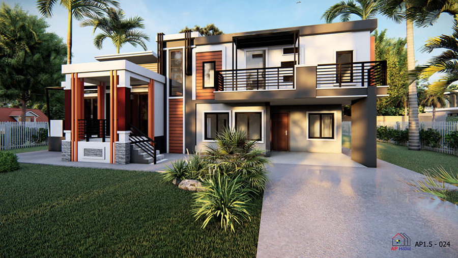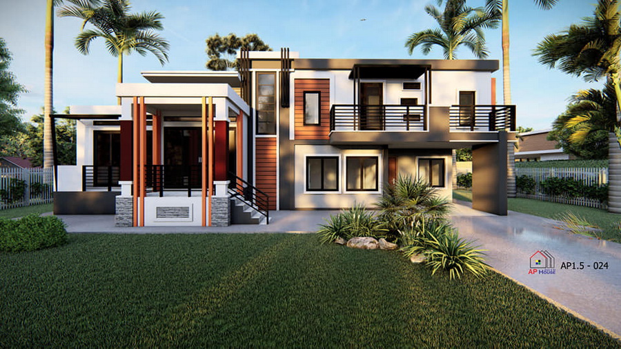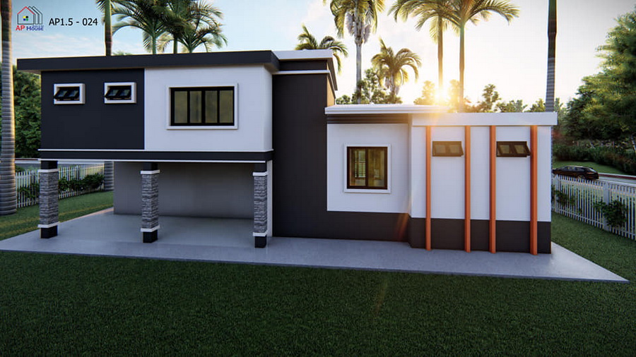 บ้านหลังนี้เป็นบ้านขนาดชั้นครึ่ง ตัวบ้านมีรูปแบบการดีไซน์ด้วยรูปทรงสี่เหลี่ยมหน้ากว้างแบบเรขสคณิต จึงให้รูปลักษณ์ที่สวยงามทันสมัย ด้านการตกแต่งนั้น ผนังภายนอกเลือกใช้โทนสีเทา สีขาวครีม สีดำและสีน้ำตาลผสานกันอย่างสวยงามลงตัว