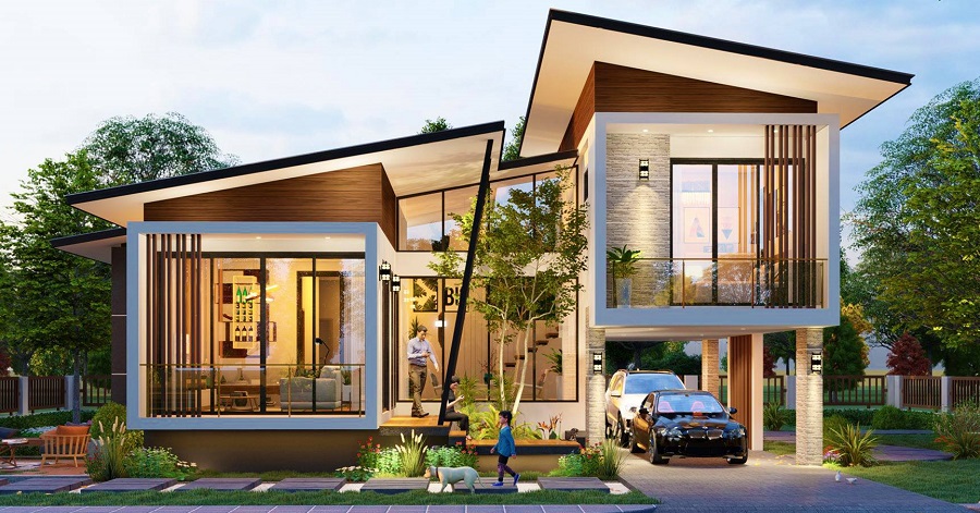 ลักษณะบ้านชั้นครึ่ง หลังคาทรงปีกนกเล่นระดับสวยงาม ตัวอาคารมีลักษณะเป็นกล่องทรงสี่เหลี่ยมสองกล่องแยกกัน โดยมีส่วนอาคารตรงกลางที่คอยเชื่อมต่อกล่องทั้งสอง ออกแบบพื้นที่เล่นระดับระหว่างชั้นแรกและชั้นบน พร้อมด้วยที่จอดรถใต้ถุนที่กว้างขวางสะดวกสบาย