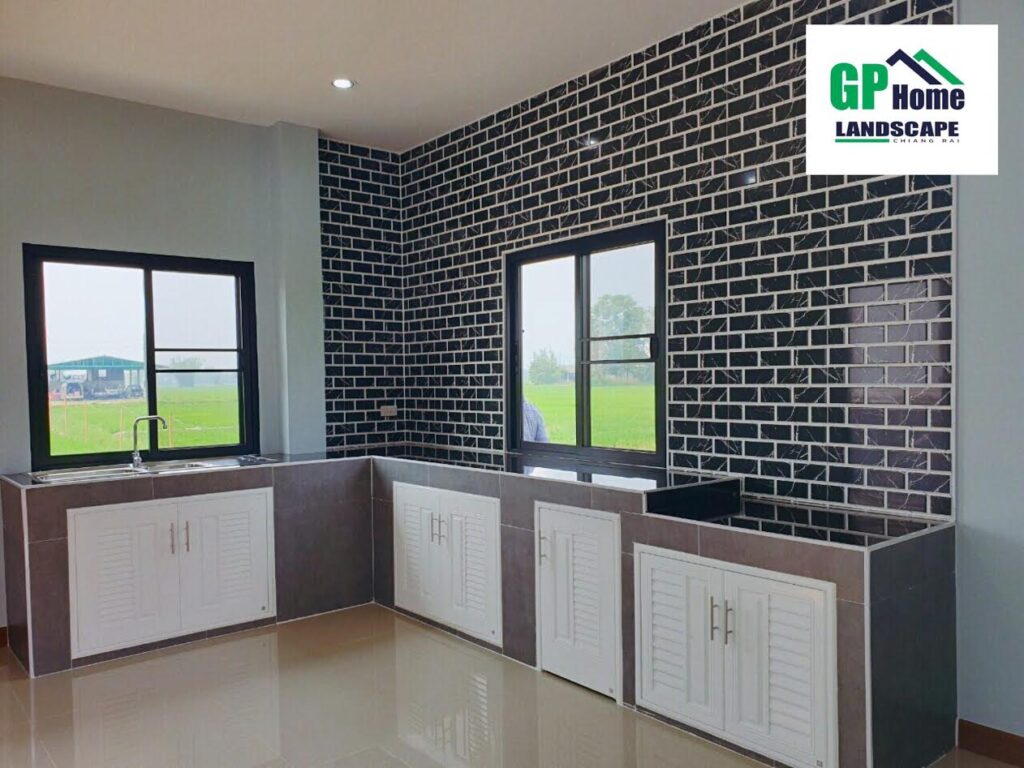 ห้องครัวมีการตกแต่งอย่างโดดเด่นด้วยผนังลายอิฐโทนสีดำ พร้อมเคาน์เตอร์ครัวชิดผนังทรงตัวแอลที่ช่วยเพิ่มความสะดวกในการทำอาหาร