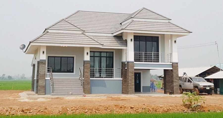 ลักษณะตัวบ้านชั้นครึ่ง ดีไซน์หลังคาซ้อนชั้นมุงด้วยกระเบื้องแผ่นเรียบ ผนังภายนอกตกแต่งด้วยโทนสีขาว เทา และฟ้าอมเทา พร้อมตกแต่งด้วยเสาหินทรายเพิ่มความสวยงาม