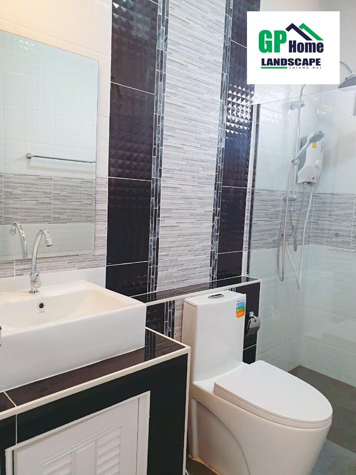 ห้องน้ำมีดีไซน์ที่ครบครัน ตกแต่งอย่างสวยงามทันสมัยด้วยกระเบื้องหลากหลายรูปแบบ แบ่งพื้นที่ใช้งานแห้งเปียกออกจากกันอย่างเป็นสัดส่วนด้วยพาร์ทิชั่นกระจกใส