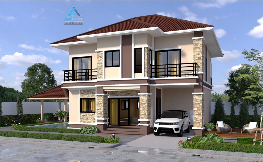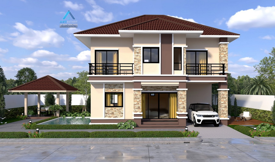 แบบบ้านสไตล์คอนเทมโพรารี ผลงานการออกแบบโดย Art-HOME เป็นแบบบ้านหลังใหญ่ที่มีพื้นที่ใช้สอยกว้างขวาง มีห้องนอนถึง 5 ห้อง จึงเหมาะกับครอบครัวใหญ่ที่ต้องการพื้นที่ให้เพียงพอต่อจำนวนสมาชิกของบ้าน มาชมรายละเอียดกันเลยจ้า
