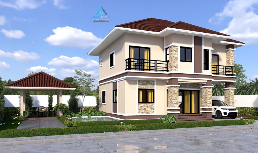 แบบบ้านสองชั้นสไตล์คอนเทมโพรารีหลังนี้ประกอบไปด้วย 5 ห้องนอน 4 ห้องน้ำ 1 ห้องรับแขก 1 ห้องครัว 1 ห้องรับประทานอาหาร 1 ที่จอดรถ 1 ศาลานั่งเล่น พื้นที่ใช้สอยทั้งหมดประมาณ 190 ตารางเมตร งบก่อสร้างอยู่ที่ประมาณ 2.4 ล้านบาท
