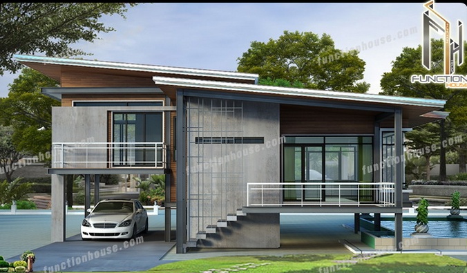 1FH016 ผลงาานจาก function house ลักษณะเป็นบ้านโครงสร้างเหลี่ยมยกสูงจากพื้น ผนังภายนอกตกแต่งดีไซน์ปูนเปลือย ลงตัวไปกับงานไม้สีอ่อนบริเวณผนังหน้าบ้านและฝ้าหลังคา เสริมด้วยแผงเหล็กดัดลวดลายทันสมัยขับให้ตัวบ้านดูมีลูกเล่นมากขึ้น พร้อมปกคลุมด้วยหลังคาทรงเพิงหมาแหงนเล่นระดับ