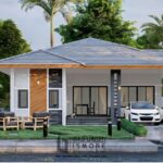 แบบบ้านหลังนี้เป็นบ้านชั้นเดียวที่มีโครงสร้างบ้านในแบบโมเดิร์นที่เรียบง่ายแข็งแรงมั่นคง โดยมีการตกแต่งให้มีกลิ่นอายบ้านทรงไทยชัดเจนด้วยหลังคาทรงมะนิลาแบบเล่นระดับพร้อมกับการตกแต่งด้วยสรไน ตัวบ้านตกแต่งในโทนสีขาวครีมตัดกับสีน้ำตาลแดงจากหลังคาและกรอบหน้าต่าง