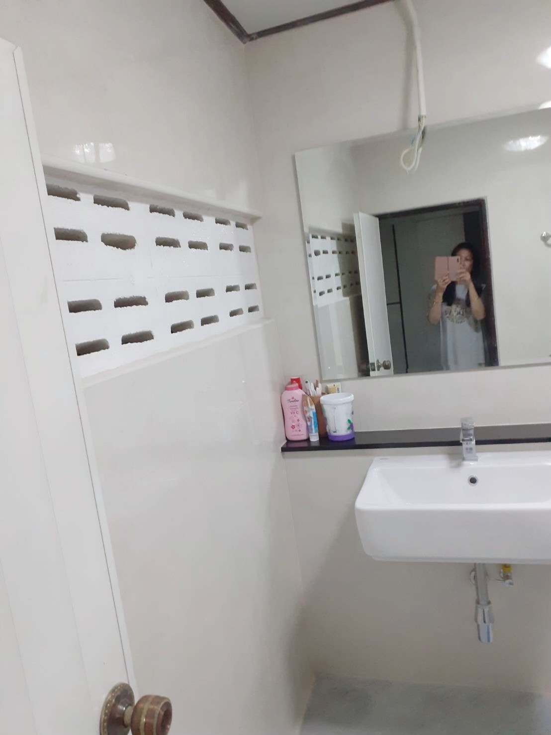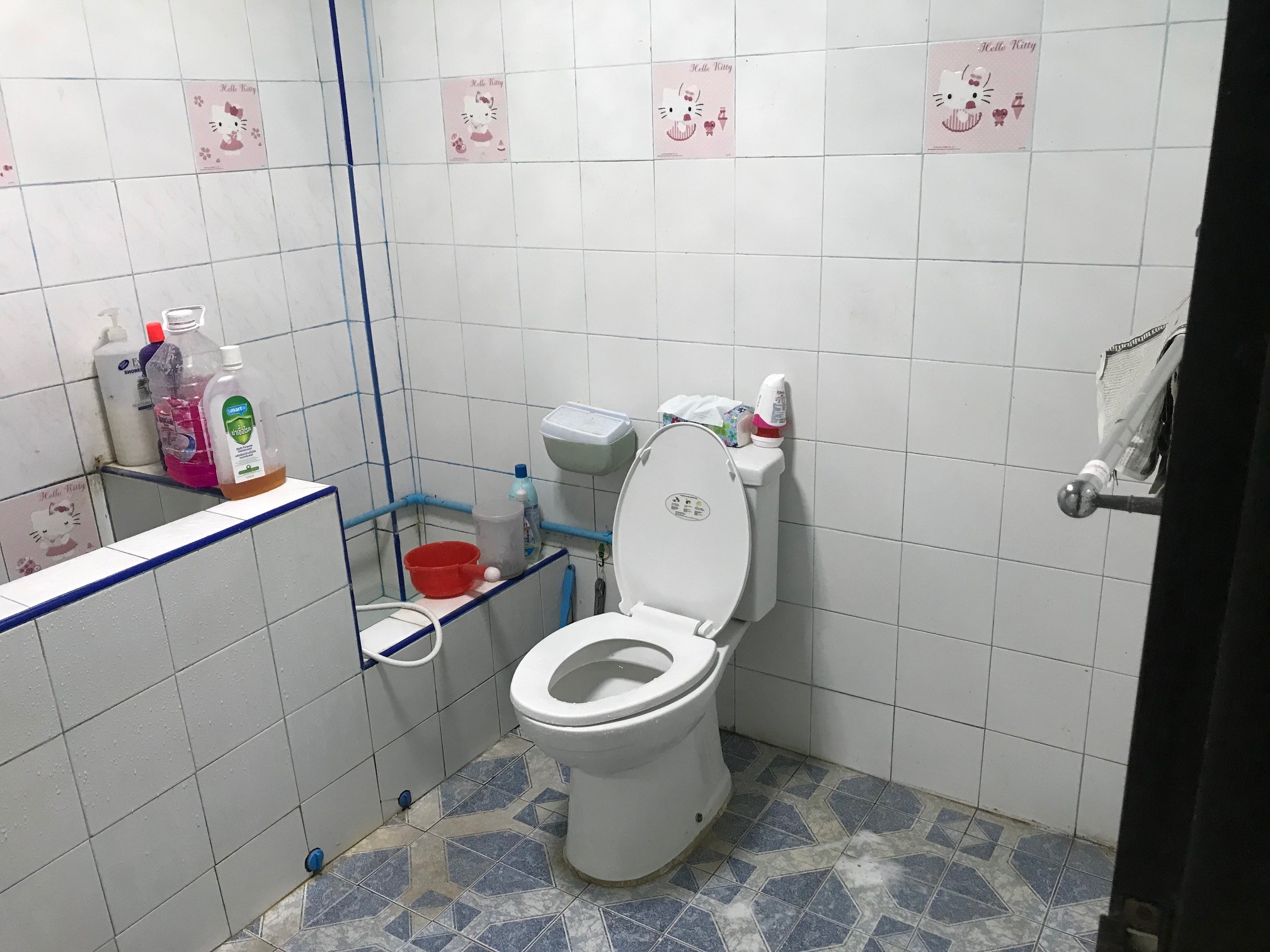 สภาพห้องน้ำเดิม จะเห็นได้ว่ามีการติดลายกระเบื้องที่เน้นสีขาว รวมถึงเป็นลวดลายการ์ตูนต่าง ๆ อีกด้วย