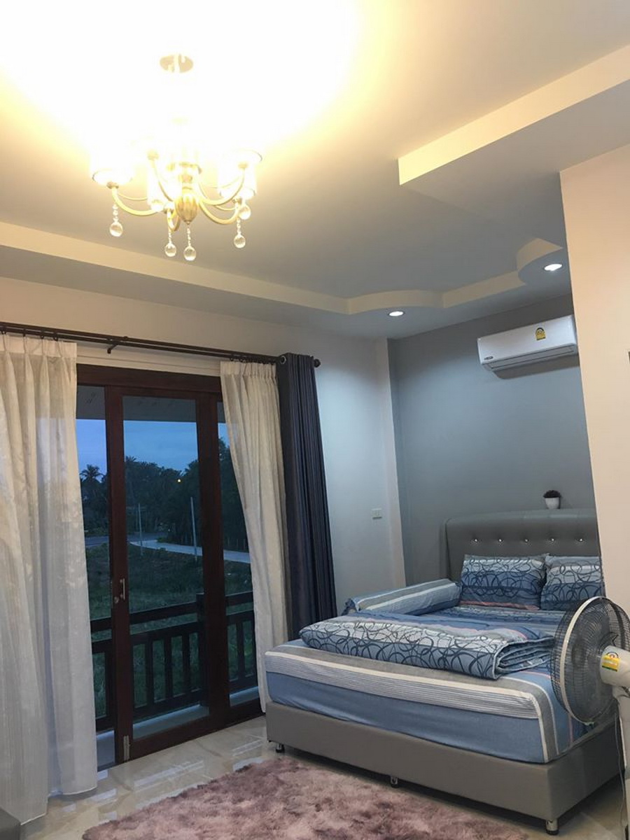 ทางด้านห้องนอนเป็นห้องที่มรขนาดพอเหมาะ ภายในสว่างและมีมิติด้วยผนังสีขาว ประดับด้วยโคมไฟระย้าแบบคริสตัล ทำให้ห้องมีเสน่ห์มากยิ่งขึ้น