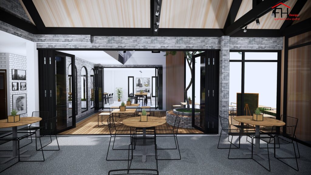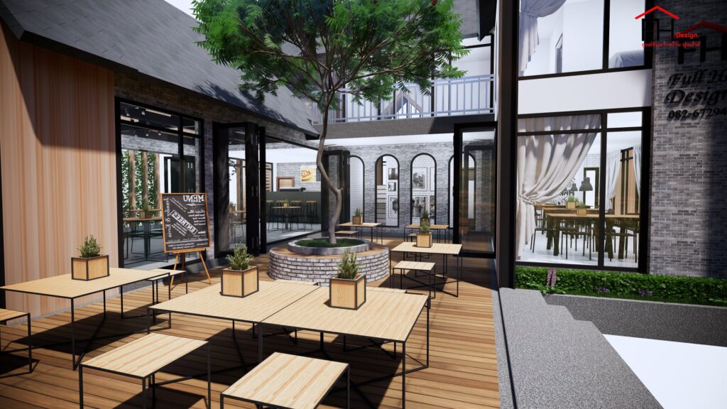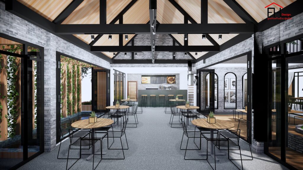 บ้านขนาดสองชั้น ตัวอาคารมีลักษณะรูปทรงตัวยู โดยส่วนหน้าที่ยื่นออกมาเป็นฟาซาดที่มีหลังคาทรงจั่วพร้อมกระจกบานใหญ่ที่เผยให้เห็นรายละเอียดการตกแต่งภายใน พร้อมทั้งจัดพื้นที่ตรงกลางให้เป็นโซนโต๊ะลูกค้ากลางแจ้งที่บรรยากาศดีสุด ๆ