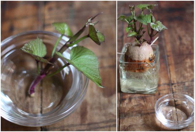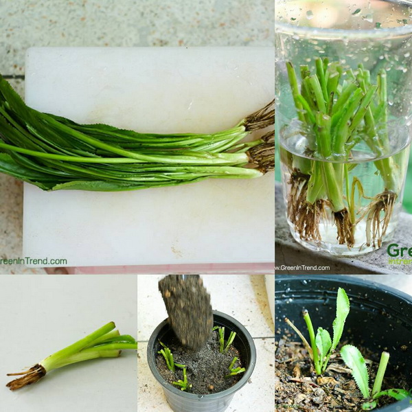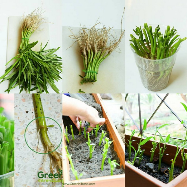 นำผักบุ้งที่ซื้อมาเป็นกำ เรียงให้รากอยู่เสมอกัน ก็ตัดตรงก้าน นับจากรากขึ้นมา 2-3 นิ้ว นำรากไปแช่น้ำไว้ 1-2 วัน ใส่ในภาชนะใสที่มองเห็นได้ เพราะเราจะสังเกตรากใหม่ที่