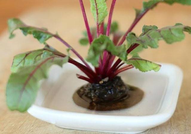 นำส่วนโคนผักกาดใส่ถ้วยก้นล