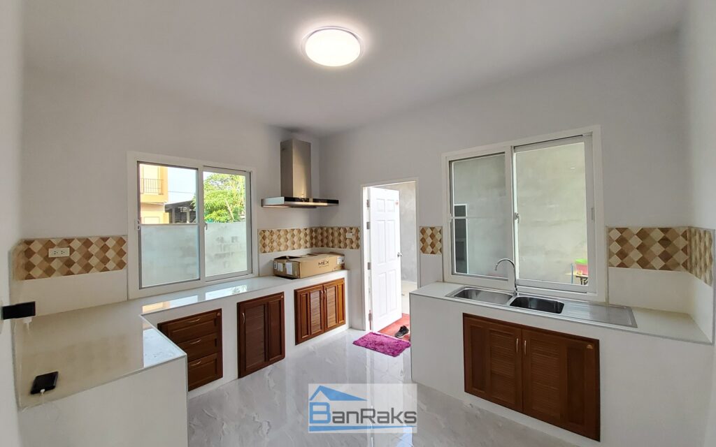 ห้องครัวของบ้านหลังนี้เรียกได้ว่าครบครันทันสมัย ด้วยเคาน์เตอร์ที่ติดตั้งถึงสองจุด มีทั้งเคาน์เตอร์ทรงตัวแอลซึ่งมีไว้ประกอบอาหาร ส่วนเคาน์เตอร์ทรงตัวไอนั้นมีไว้สำหรับล้างจานครับ