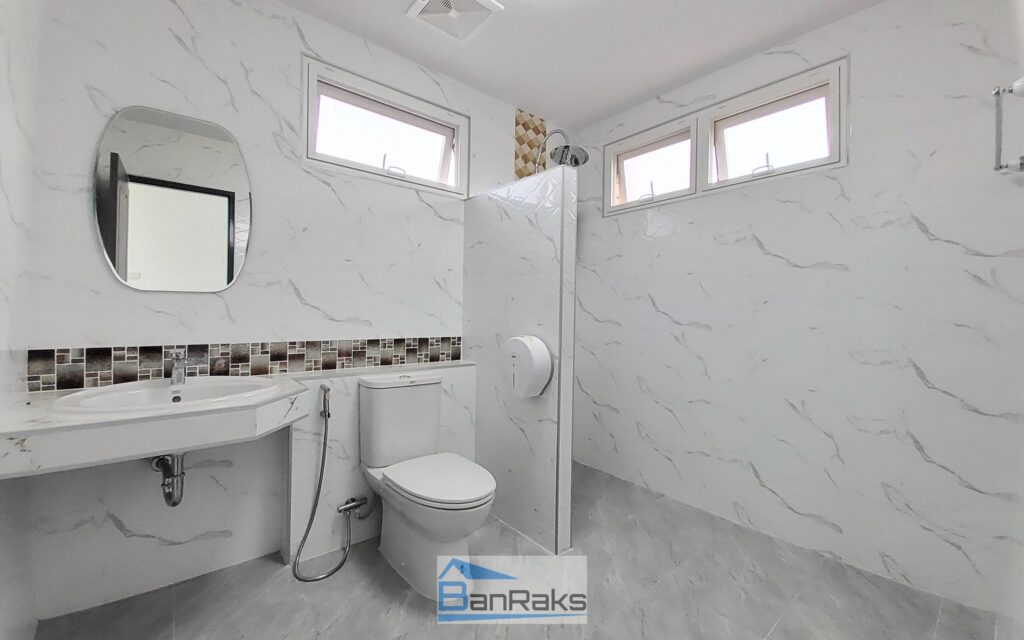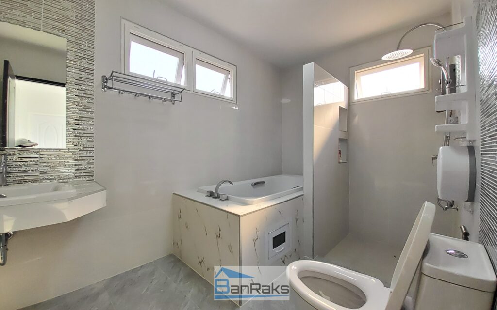ห้องน้ำของบ้านหลังนี้มีการตกแต่งที่เน้นความหรูหรา ฟังก์ชันครบครันทั้งฝักบัวอาบน้ำ อ่างอาบน้ำ ชั้นวางต่าง ๆ โดยมีการตกแต่งในโทนสีขาวและเทาเป็นหลัก วัสดุที่ใช้ก็มีปูนเปลือยและกระเบื้องลวดลายสวยงามต่าง ๆ