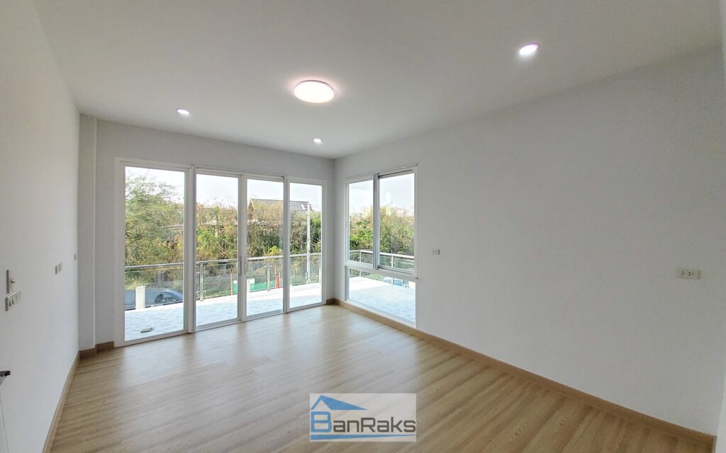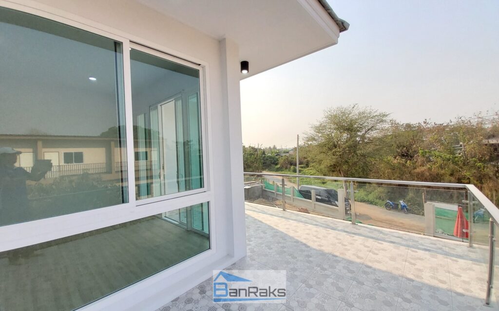 บ้านหลังนี้เลือกใช้หน้าต่างและประตูกระจก ซึ่งนอกจากจะทำให้บ้านดูมีความทันสมัยแล้ว ยังเป็นส่วนที่ช่วยสร้างความโปร่งโล่งให้กับพื้นที่ภายใน และรับแสงธรรมชาติได้อย่างเต็มที่อีกด้วย