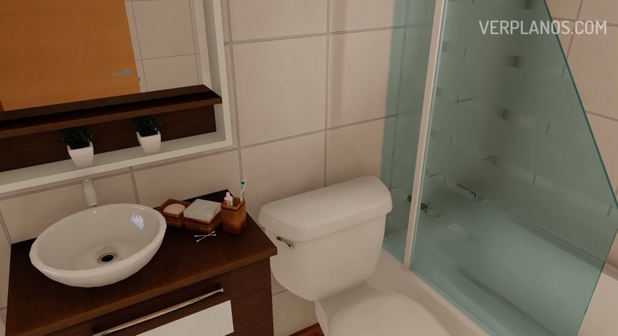 ห้องน้ำออกแบบอย่างเรียบง่าย ตกแต่งในโทนสีขาวและเฟอร์นิเจอร์ไม้ สวยงามเป็นธรรมชาติ มีกำแพงกระจกกั้นระหว่างพื้นที่แห้งและเปียก ใช้งานได้อย่างสะดวกสบาย