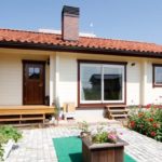 ชานด้านหน้าปูอิฐมอญแดงและพื้นหินทรายล้าง แต่งลวดลายตารางสี่เหลี่ยมสีเขียว ตัดกับโทนสีดิบๆ ของตัวบ้านให้ดูสดชื่น ควบคู่ไปกับการประดับกระถางบริเวณหน้าเฉลียงทางเข้า